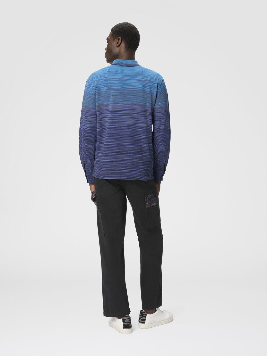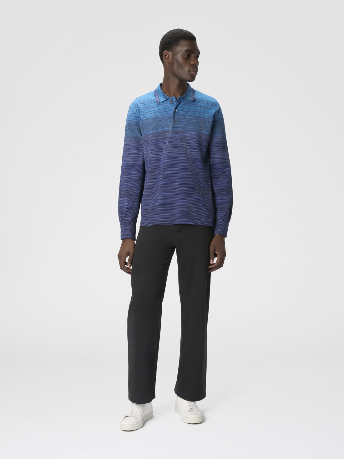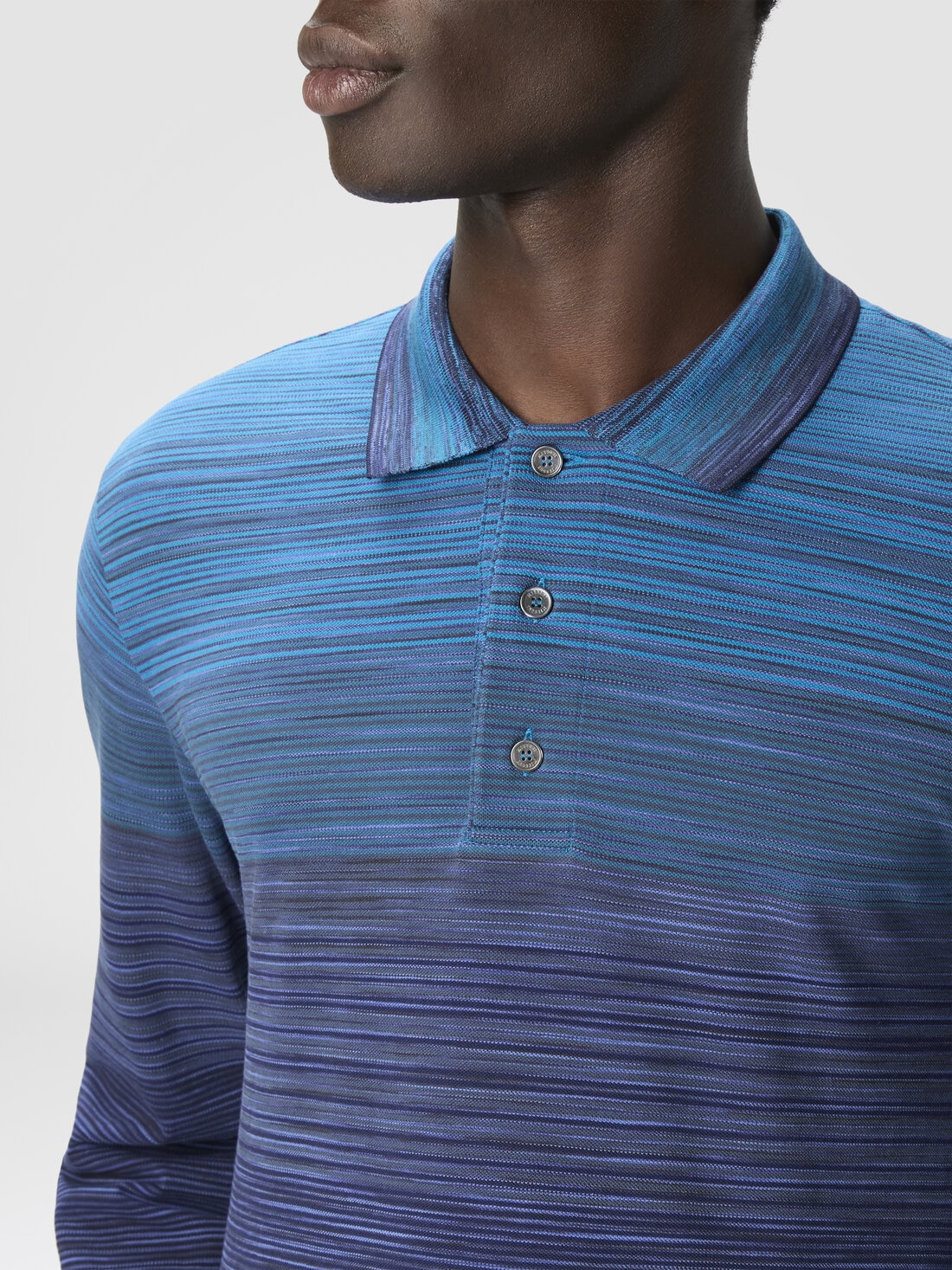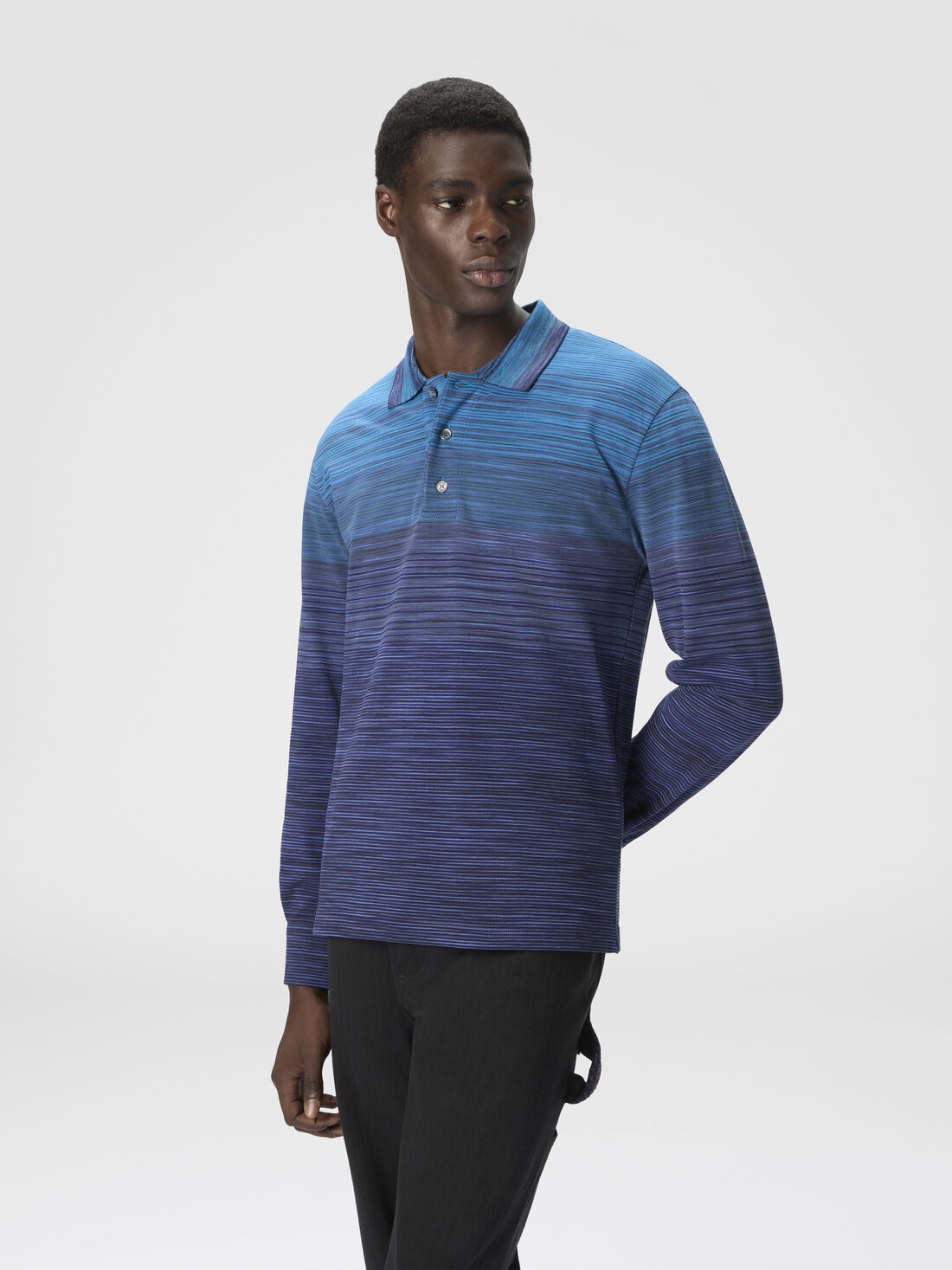 Polo à manches longues pour homme, coupe regular, réalisé en 100 % coton avec un raffiné travail en piqué flammé dégradé. La texture unique et la couleur en dégradé confèrent à la pièce une élégance discrète, parfaite pour un look sophistiqué et polyvalent alliant confort et style intemporel.