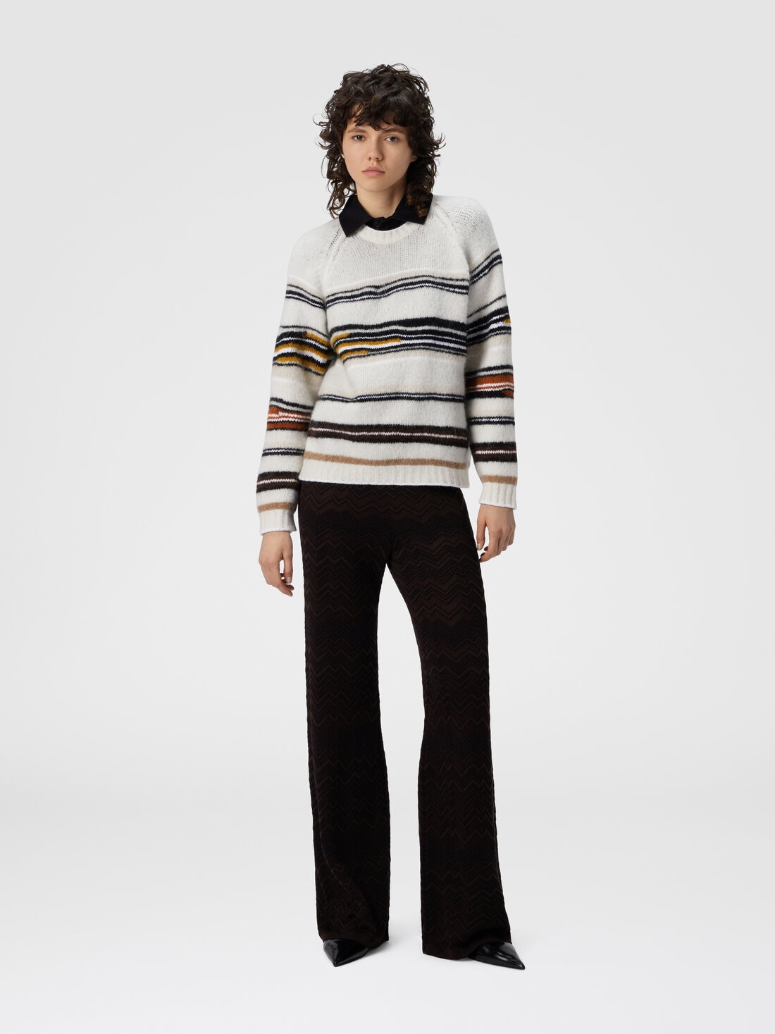 Pull oversize à manches longues et col rond pour femme, réalisé en un précieux mélange de laine, mohair et alpaga. L’intarsia à rayures met en valeur la douceur et la légèreté des fils, expression de la constante recherche de qualité et de raffinement dans les matériaux, signature distinctive de Missoni.