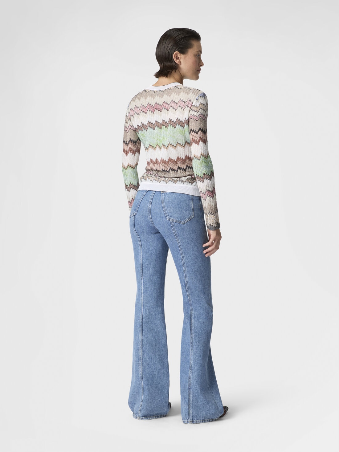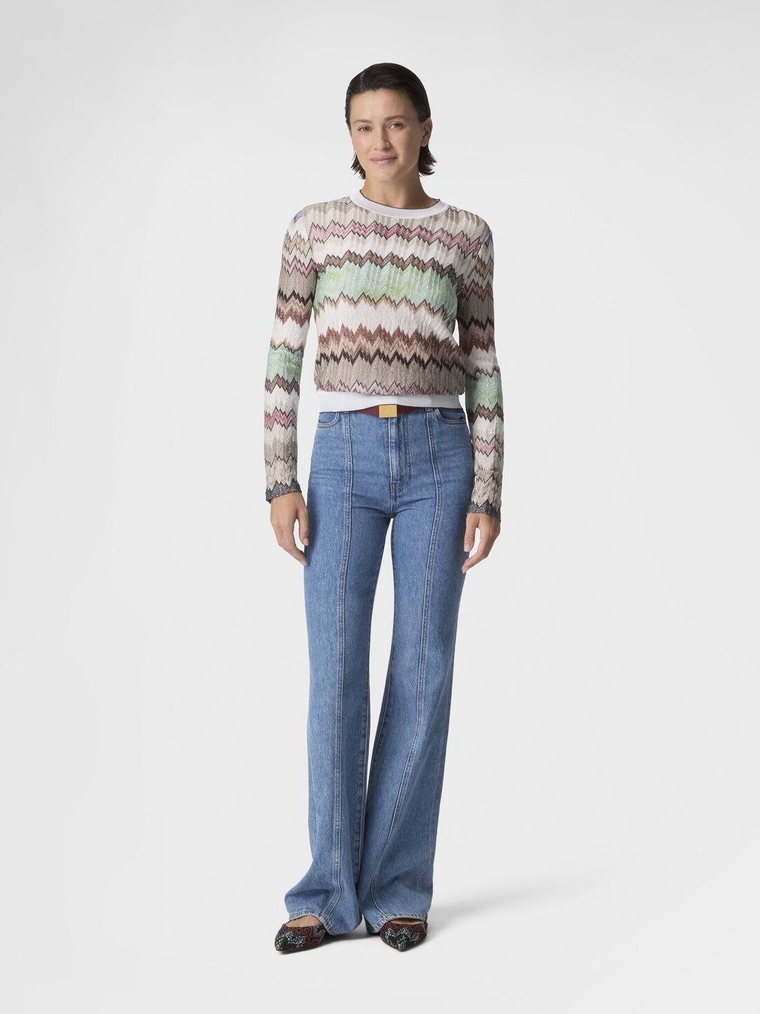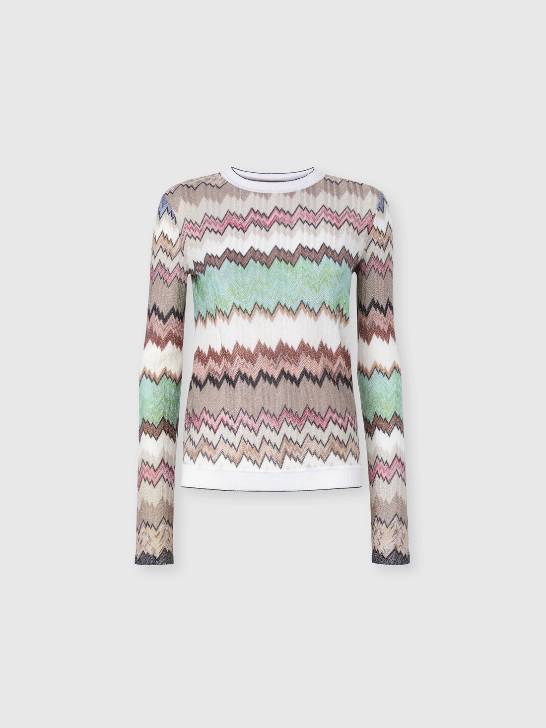 Le motif serpent irrégulier prend forme sur ce pull à col rond pour femme en viscose lamé, orné de finitions contrastées et d’un travail raschel sophistiqué qui en accentue la luminosité.
