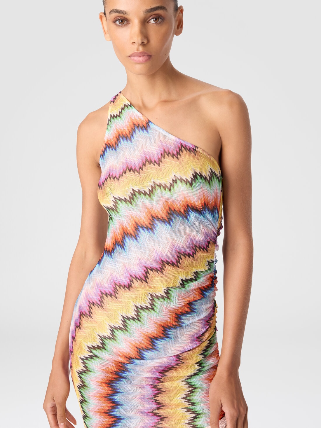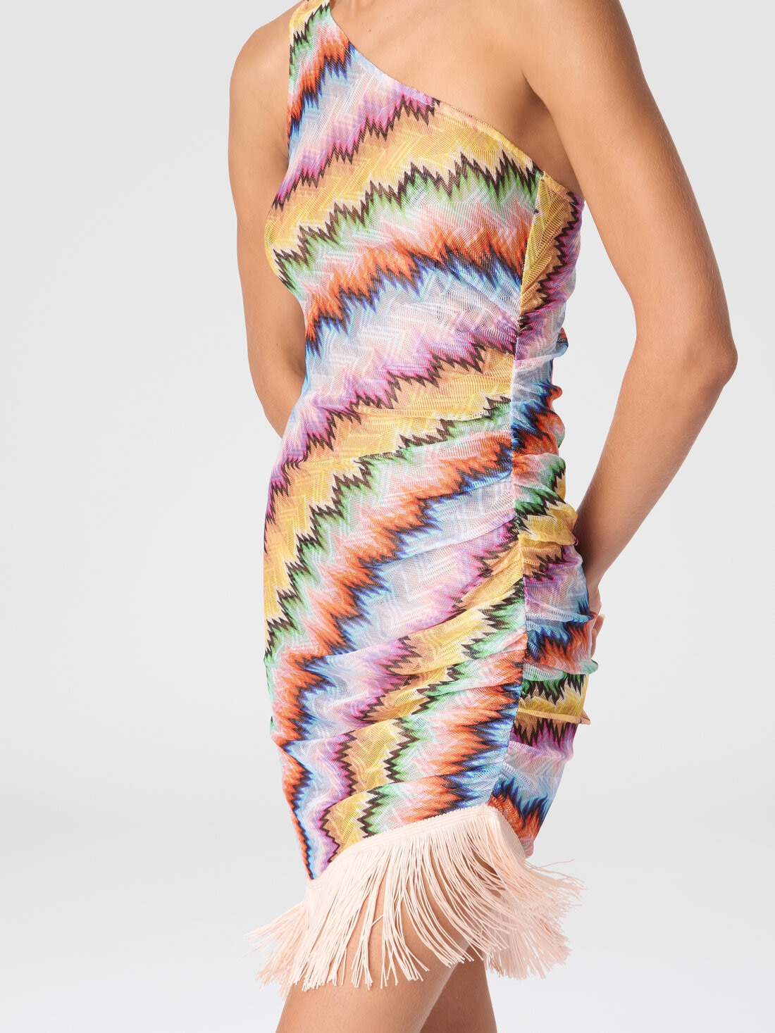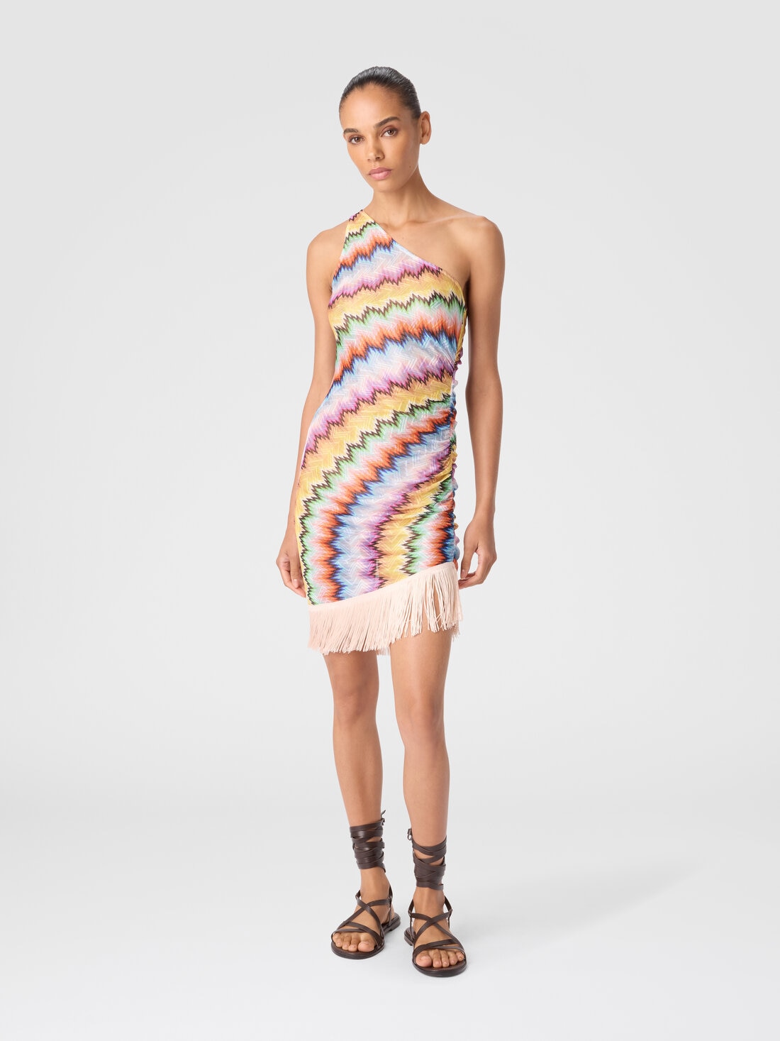 Ce paréo court asymétrique pour femme, terminé par des franges, réinvente avec élégance le style estival classique. Le tricot raschel crée un motif de rayures dégradées micro et macro dessinant un zigzag dynamique, actualisation moderne des célèbres géométries Missoni. Les franges contrastantes ajoutent une touche de mouvement et de légèreté, parfaite pour les journées ensoleillées.