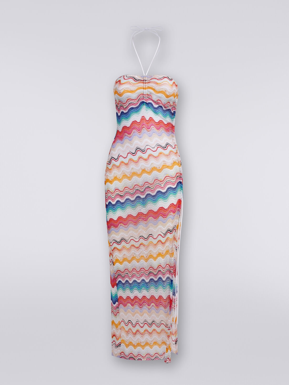 Soutenue par de fines bretelles partant du centre du vêtement et drapant l'encolure, cette longue robe de plage pour femme est confectionnée en maille de viscose-mélangée avec un motif ondulé, agrémenté d'une touche laminée de lurex.