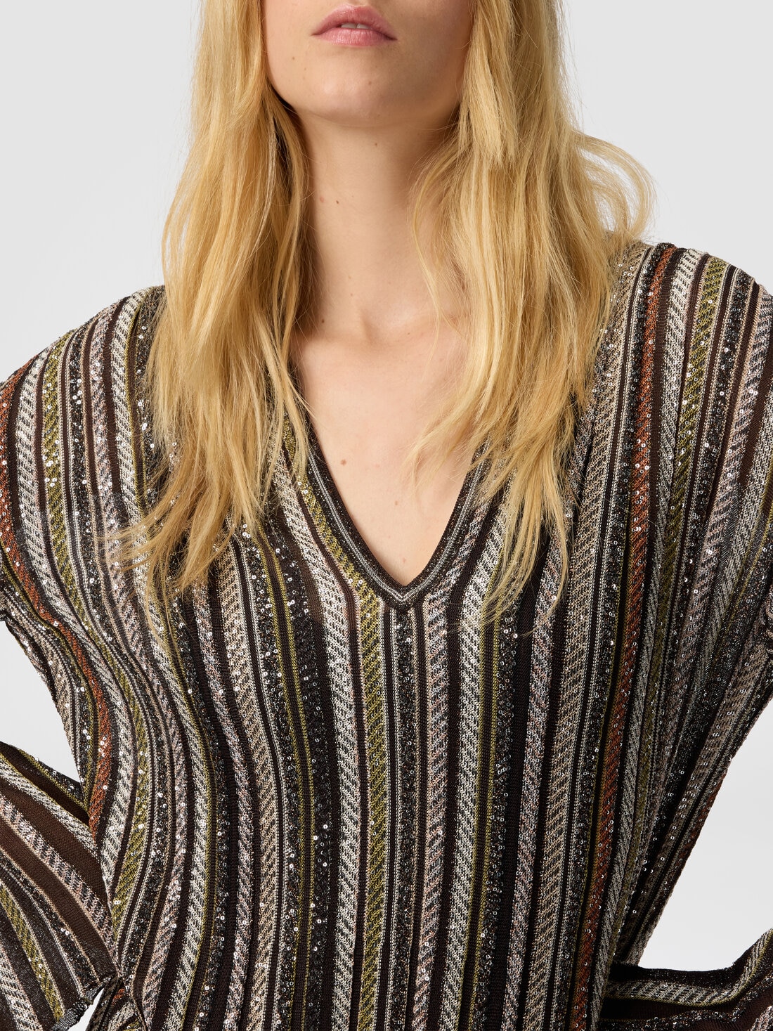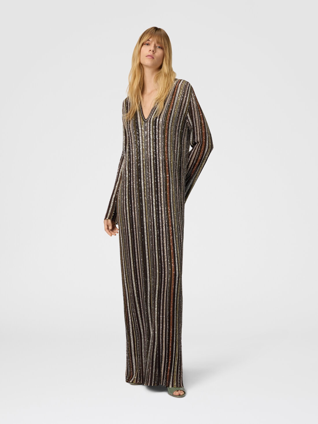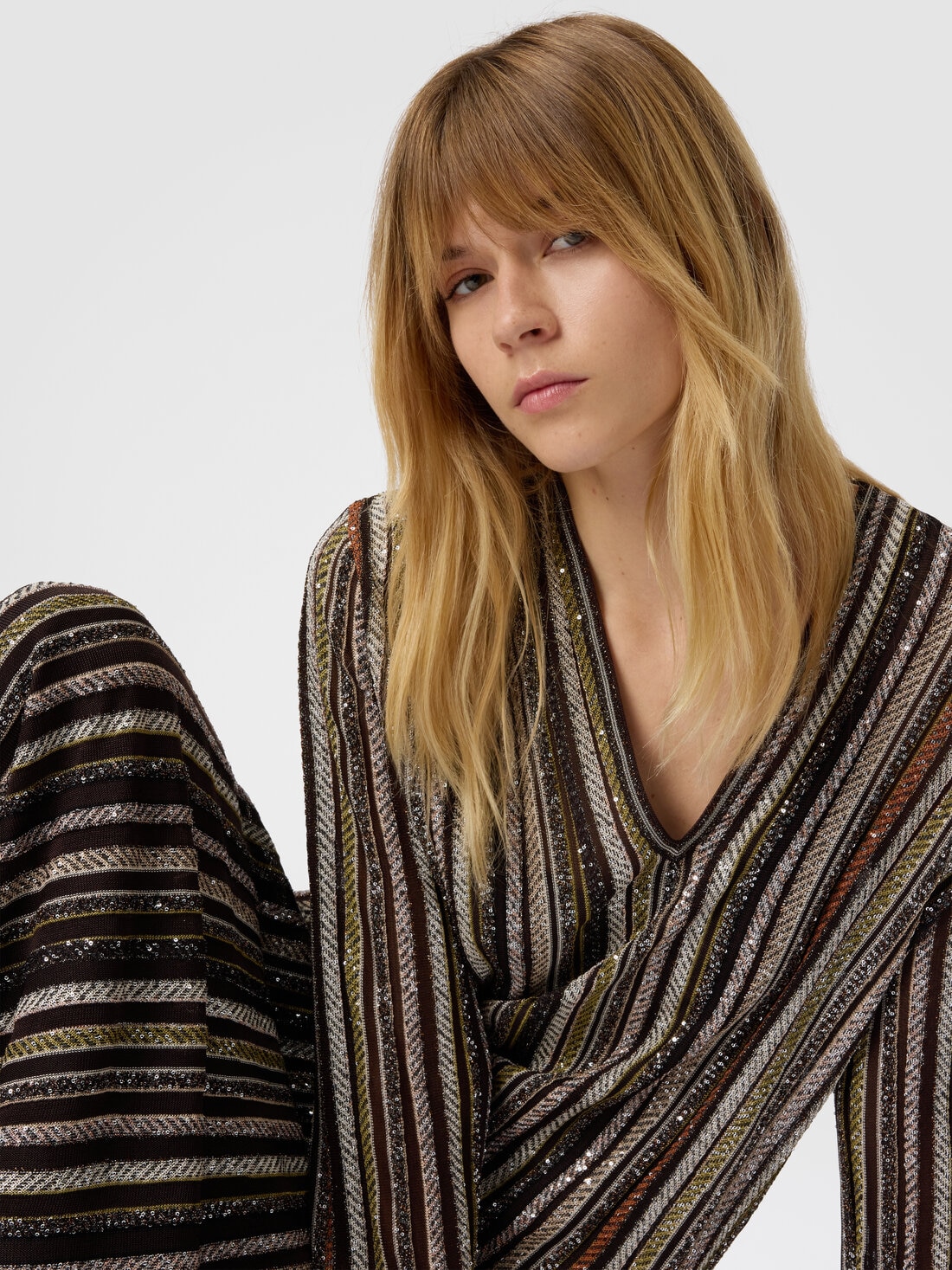 Des lignes fluides et une lumière vibrante définissent cette robe longue Missoni à manches longues et profond col en V. La maille rayée à chevrons prend vie grâce aux fils lamés et aux paillettes, apportant une brillance sophistiquée pour les événements les plus spéciaux.
