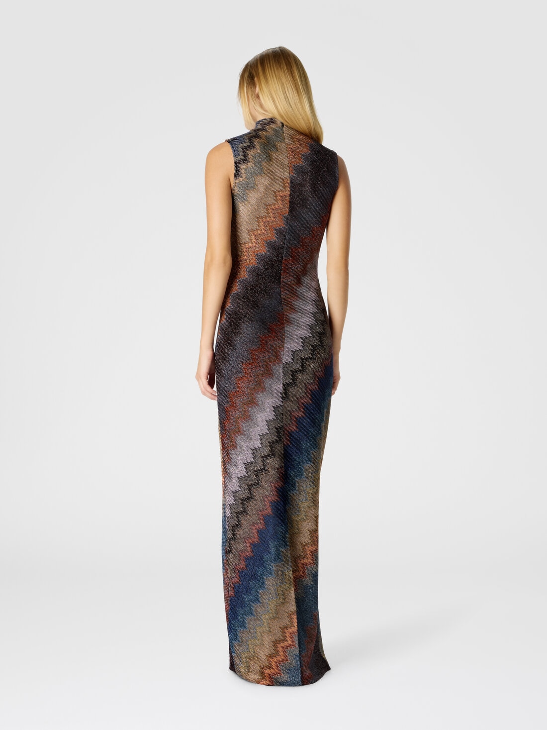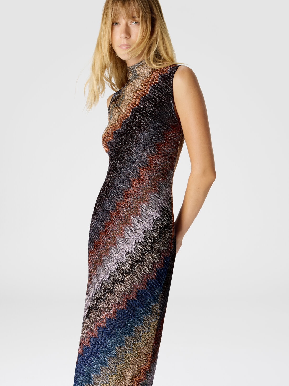 Élégante et sophistiquée, cette robe longue sans manches à col montant pour femme se distingue par un travail raschel raffiné au motif snake oblique, réinterprétant de manière contemporaine le zigzag iconique de Missoni. Les finitions lamées apportent une luminosité précieuse au tissu, soulignant la fluidité de la ligne et le soin du détail.