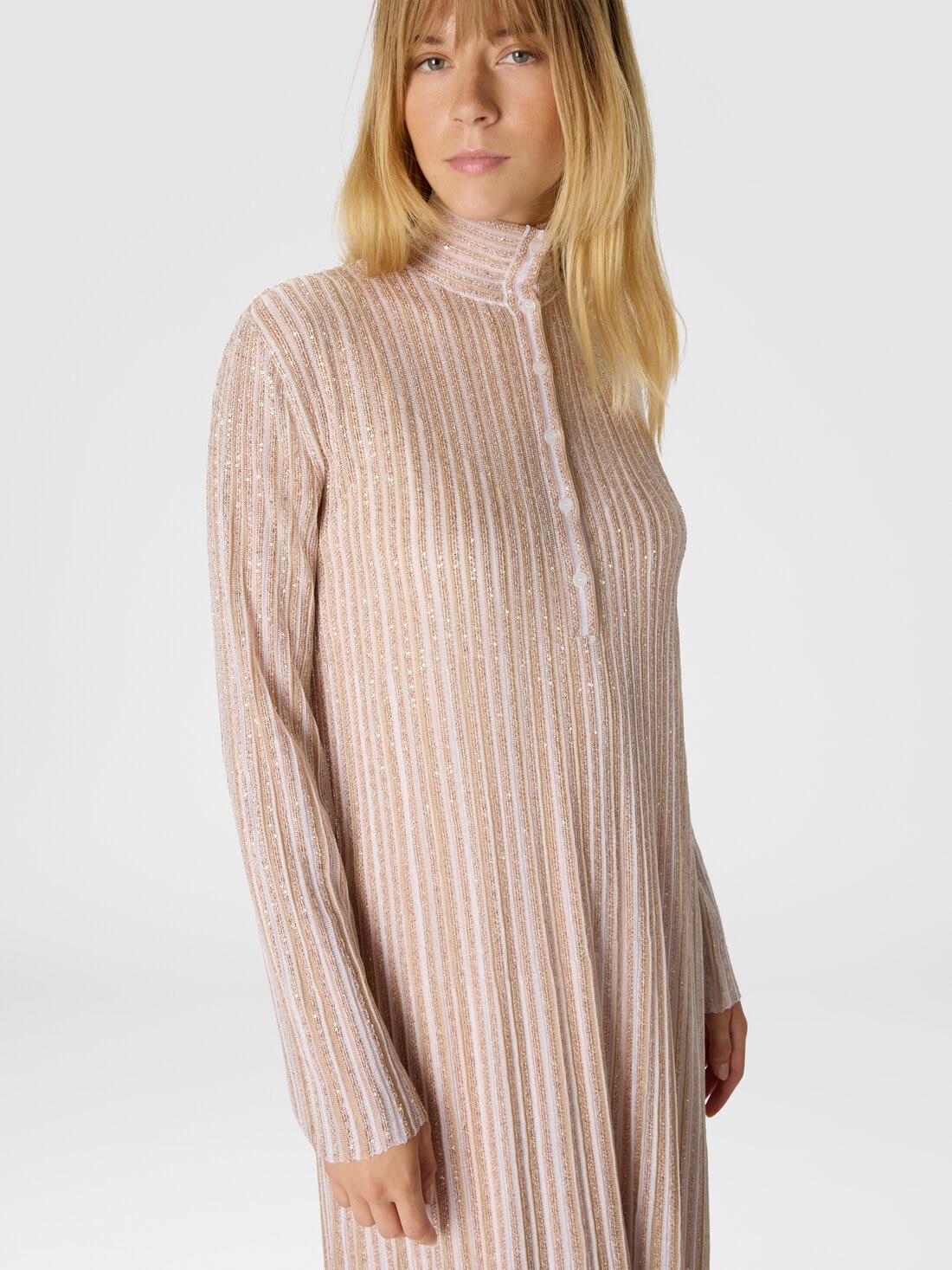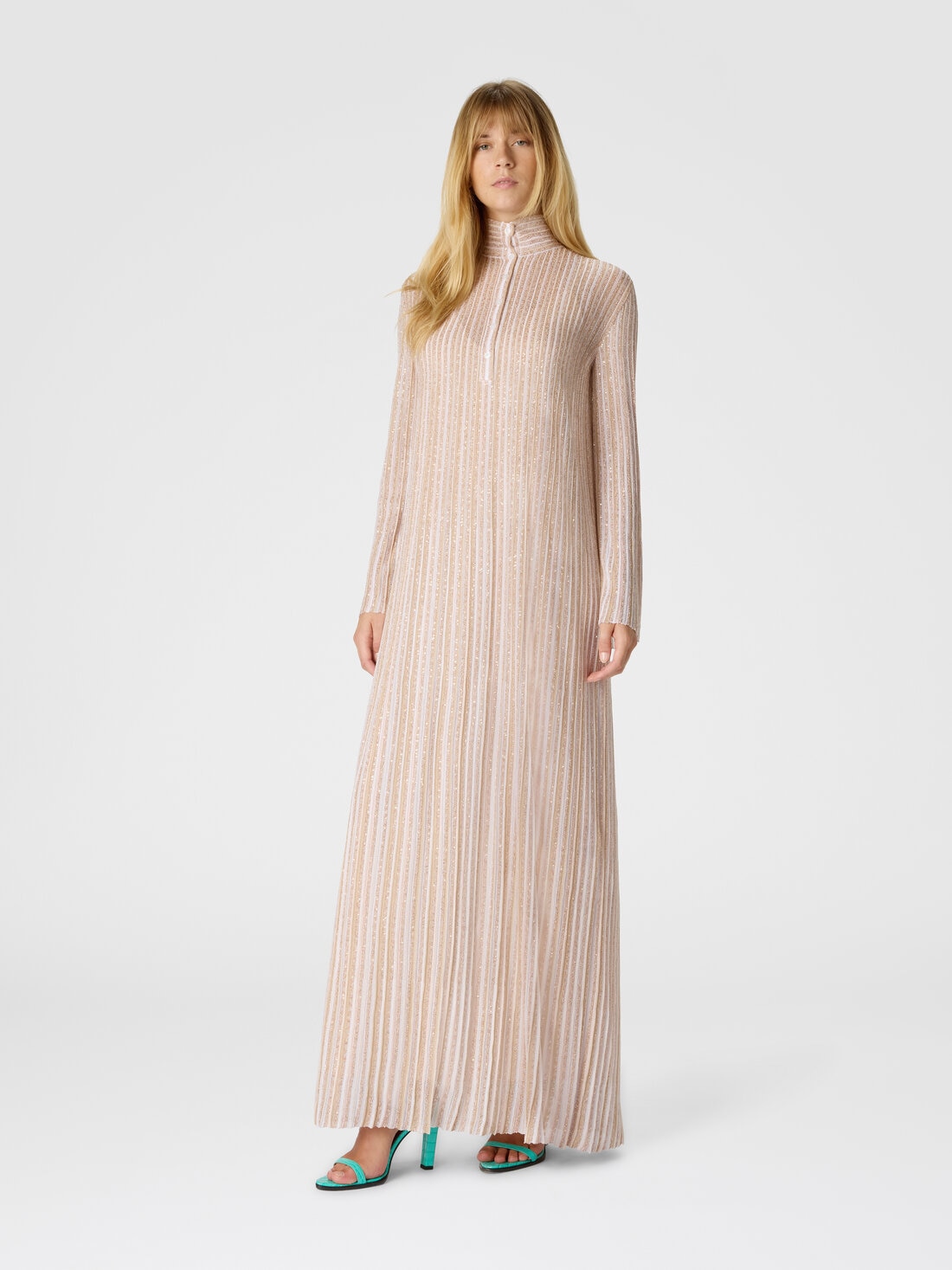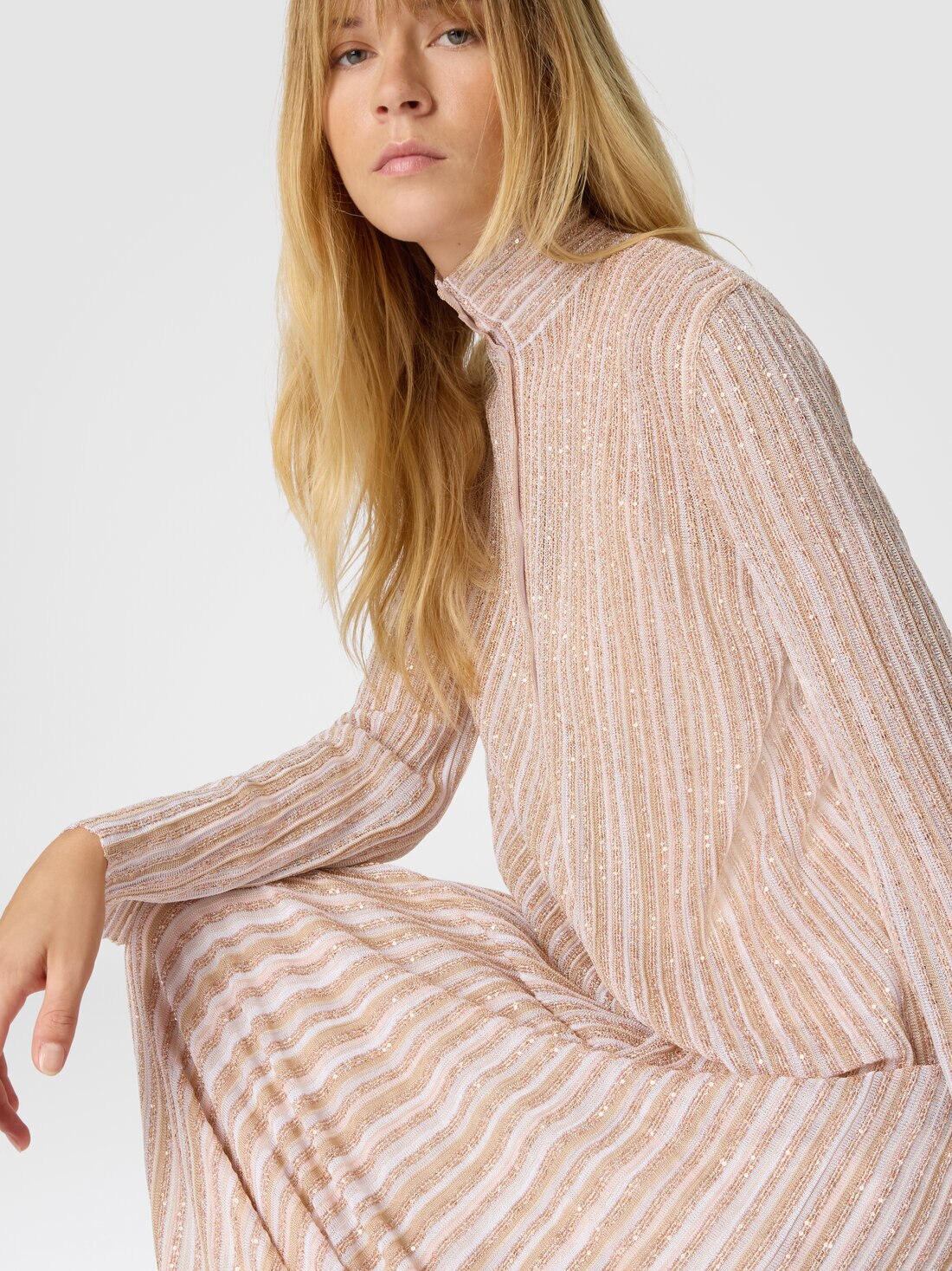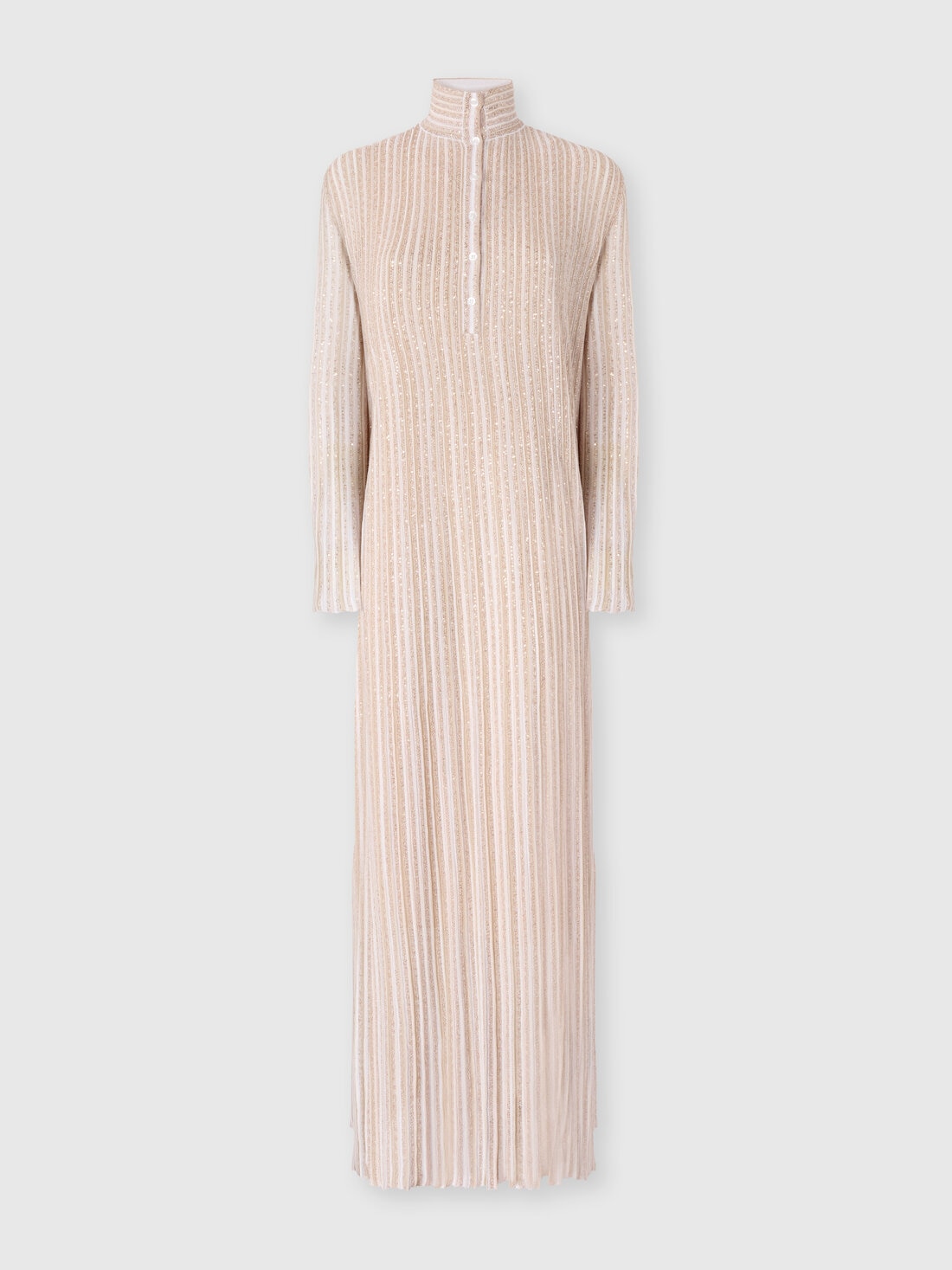Alliant élégance et raffinement, cette robe longue pour femme en maille rayée avec fils lamés est dotée de manches longues et d’une fermeture boutonnée. Des jeux de transparence viennent enrichir la silhouette fluide, ajoutant une touche de subtilité. L’ensemble crée un équilibre parfait entre classicisme et modernité, idéal pour des événements qui demandent du style et du caractère.