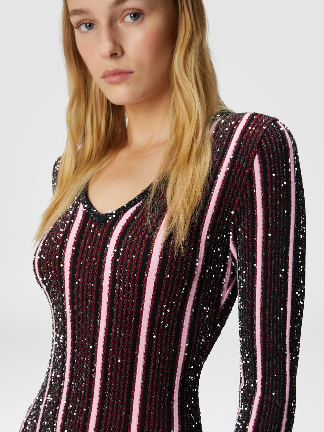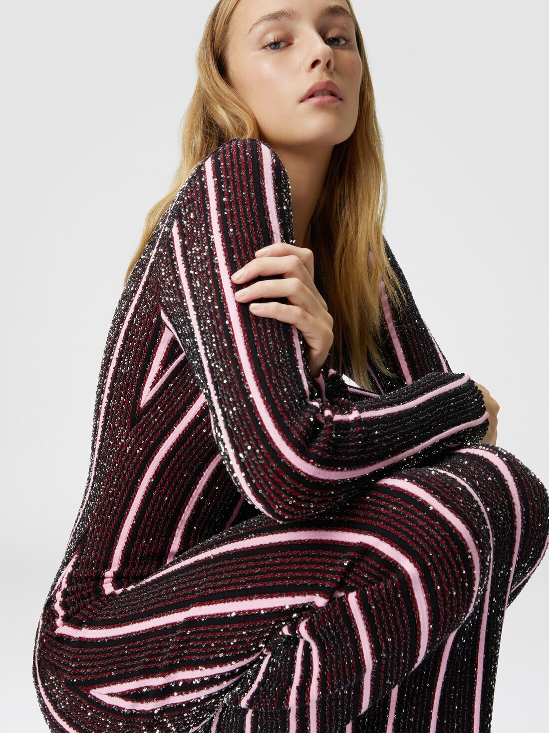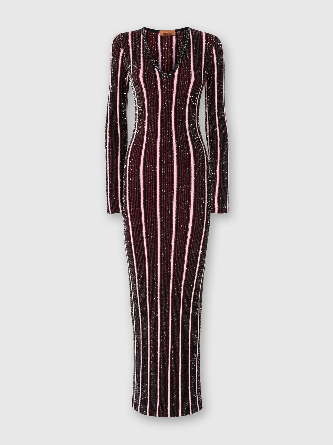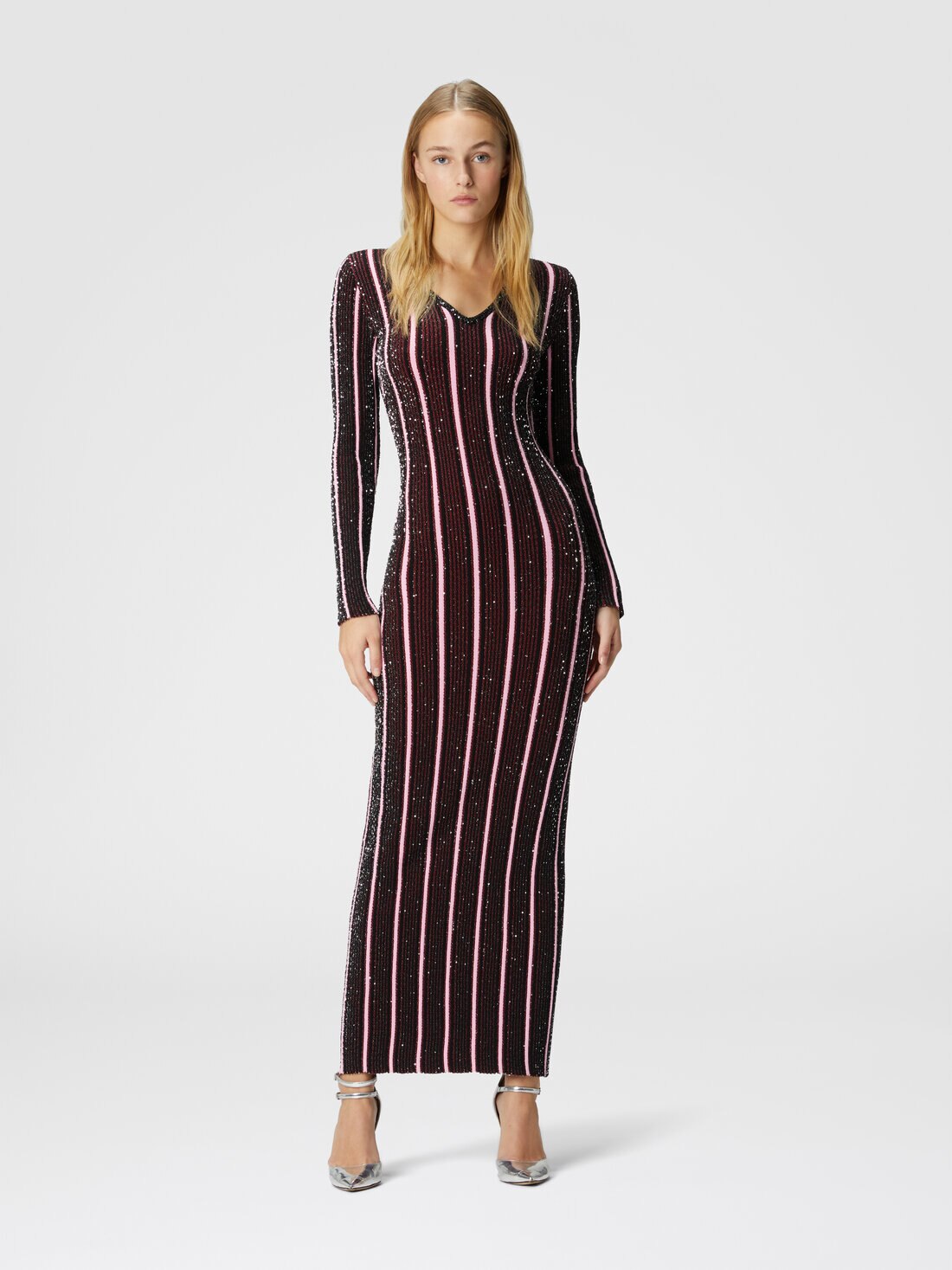 Maille côtelée, rayures verticales et appliques de paillettes : c'est ainsi que la robe longue, à manches longues et encolure en V, conquiert une place de protagoniste absolue du look du soir.