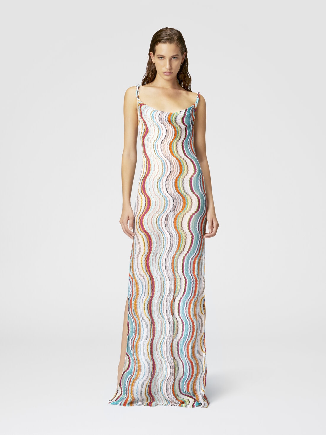 Missoni joue avec la sensualité de la nature et propose une robe longue couvrant modèle avec une finition raschel sophistiquée. La silhouette fluide, le dos nu et les fentes latérales sur la jupe donnent au vêtement une touche de sensualité classique, qui devient irrévérencieuse grâce au motif de vagues agrémenté des reflets métalliques du lurex.