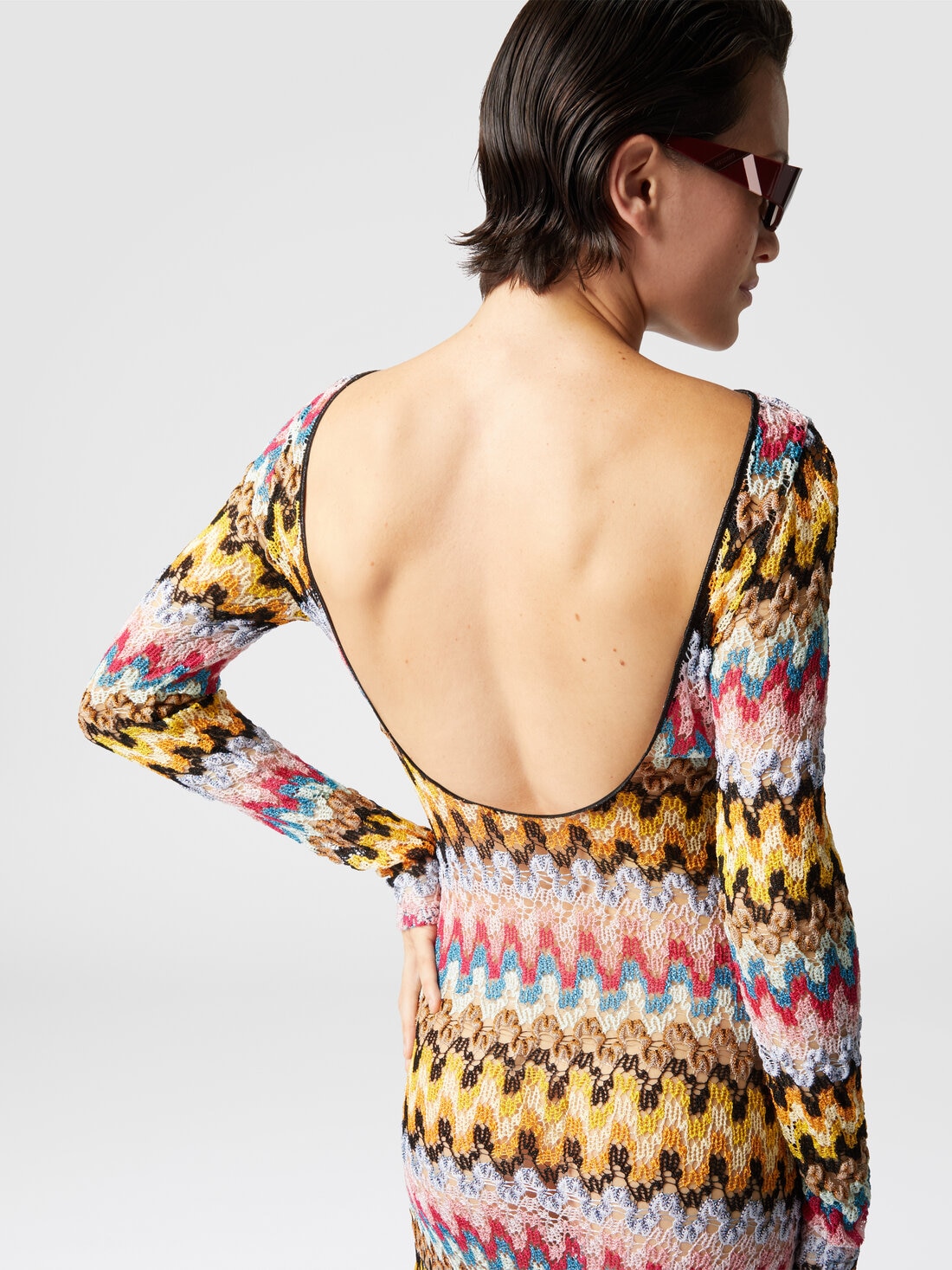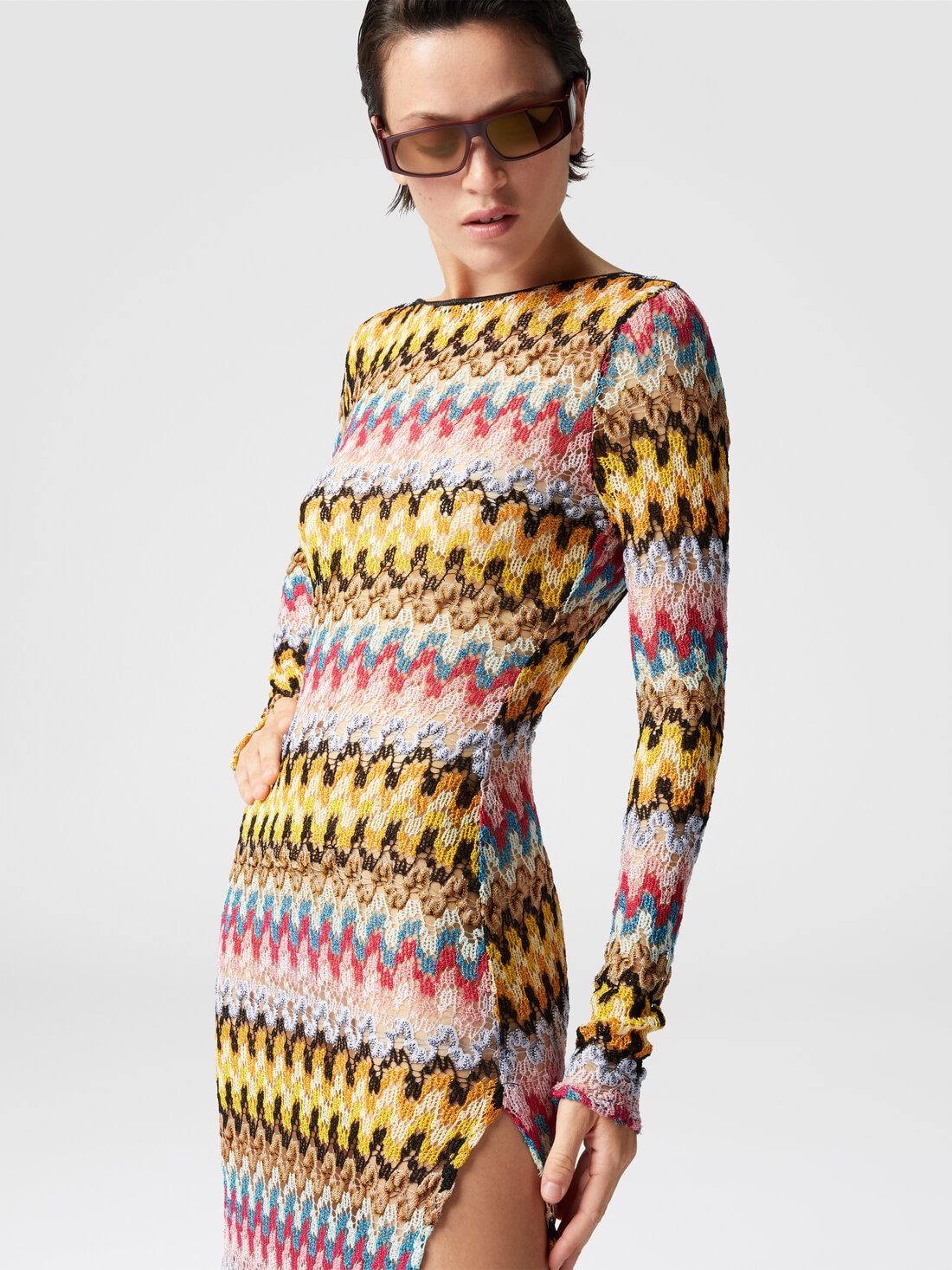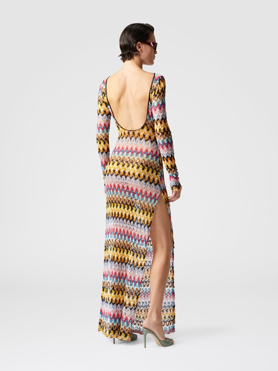 La robe longue en dentelle de viscose lamée de Missoni se distingue par son élégance sophistiquée et son savoir-faire. Le motif en zigzag, illuminé par le lamé, donne au vêtement un effet lumineux et dynamique, tandis que la silhouette fluide et légère enveloppe la silhouette de grâce. Le détail le plus séduisant est le dos nu, qui ajoute une touche sensuelle et raffinée.