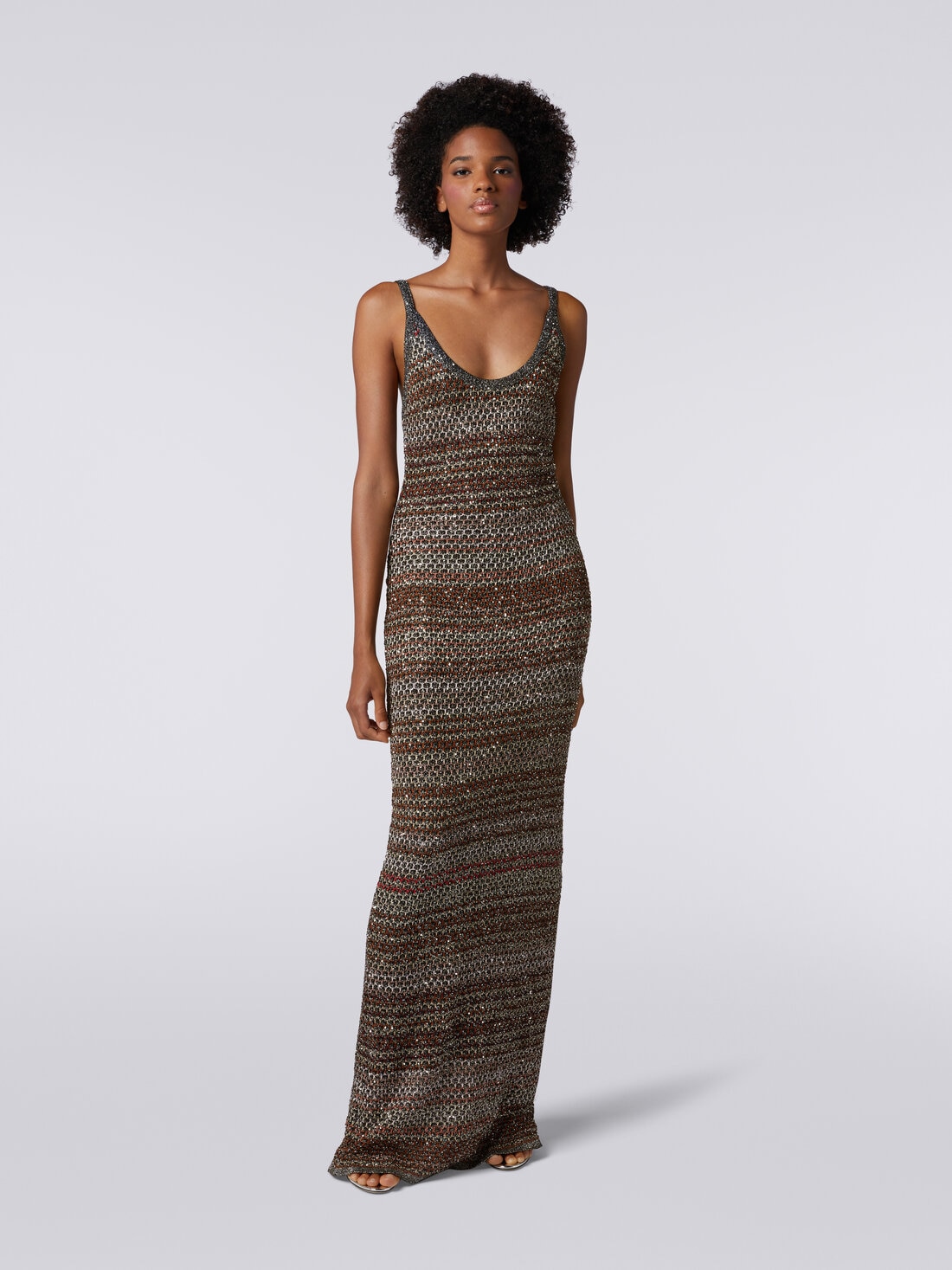 Cette robe longue pour femme en maille viscose met la silhouette en valeur. Caractérisé par un effet de crochet à grosse maille, avec un motif filet incrusté de lurex ponctué par l'application de paillettes, le vêtement est terminé par des bordures côtelées qui se prolongent sur les bretelles et se rejoignent dans le dos.