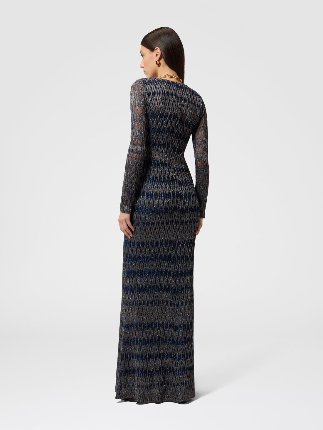 Une robe longue pour femme en mélange de viscose et de lamé, à manches longues et profond décolleté en V, qui célèbre la lumière et le mouvement. Le travail en maille raschel à motif losange tridimensionnel enrichit la texture, transformant la silhouette en un jeu raffiné de lignes et de volumes.