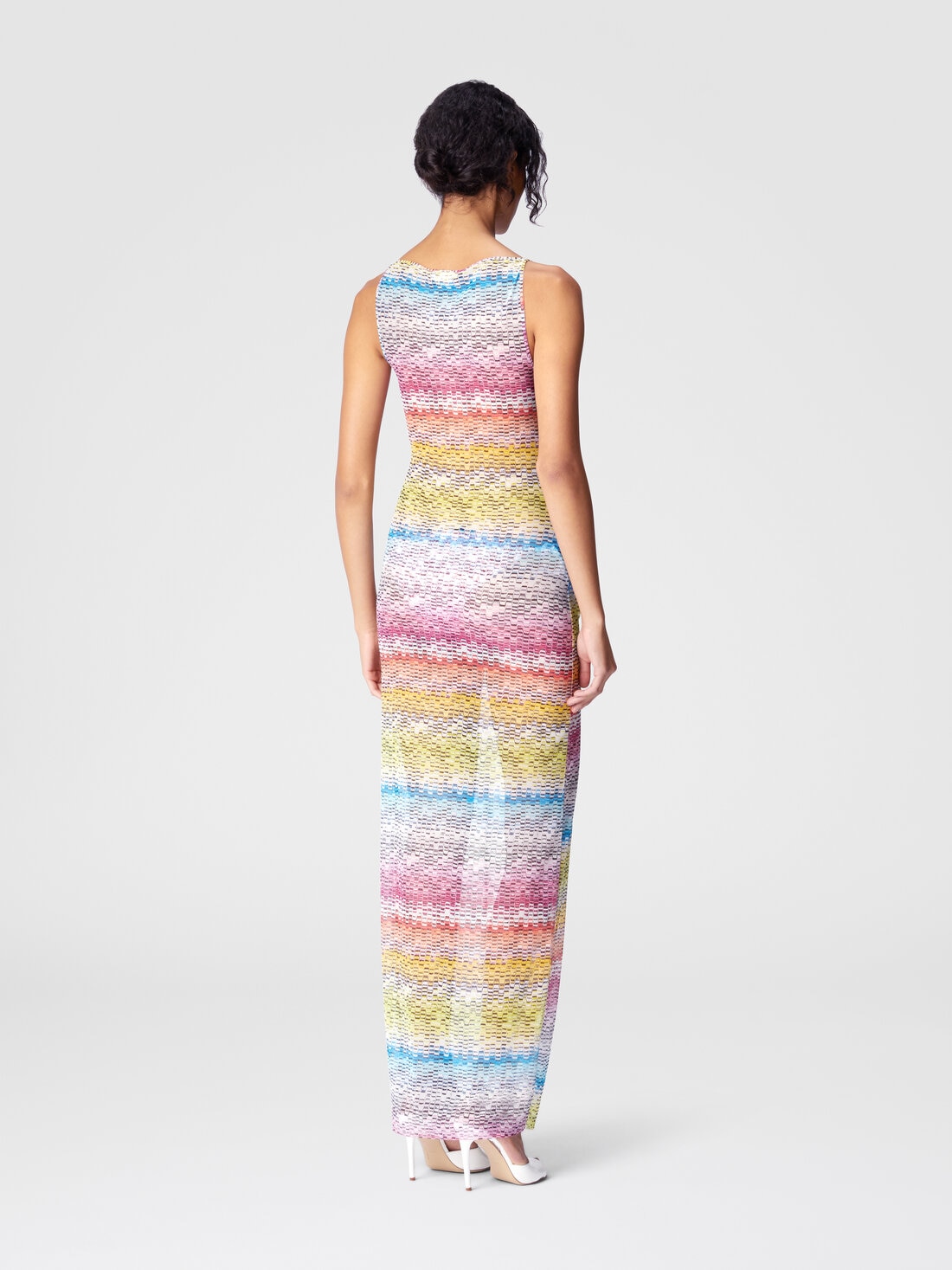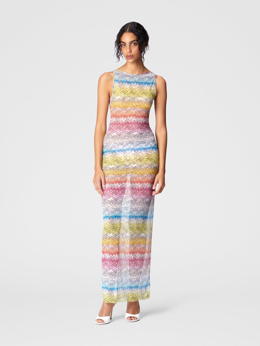 Un motif zigzag vif, jouant avec les teintes vibrantes, pour cette robe longue sans manches. Confectionné en tulle imprimé, ce modèle présente une silhouette élégante et sophistiquée. Parfait pour compléter le look de plage avec une touche de couleur et de style.
