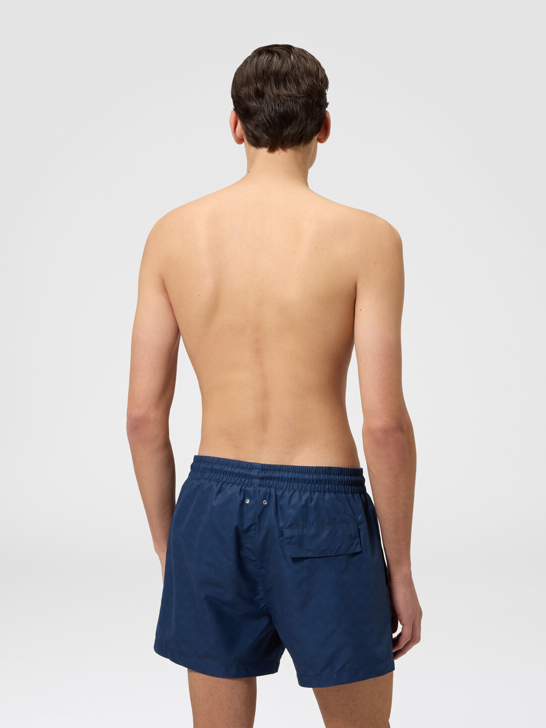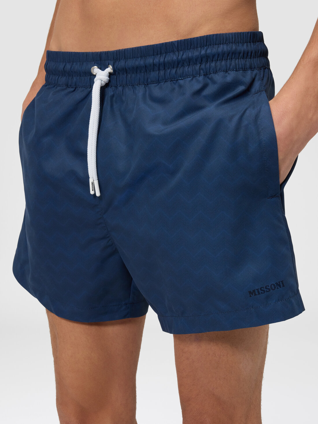 Le motif emblématique de la Maison prend vie dans ce maillot de bain mi-long pour homme, orné d’un imprimé zigzag ton sur ton qui en exalte l’élégance et le style distinctif. Il est complété par une étiquette logo appliquée sur l’ourlet, symbole authentique de l’identité Missoni.