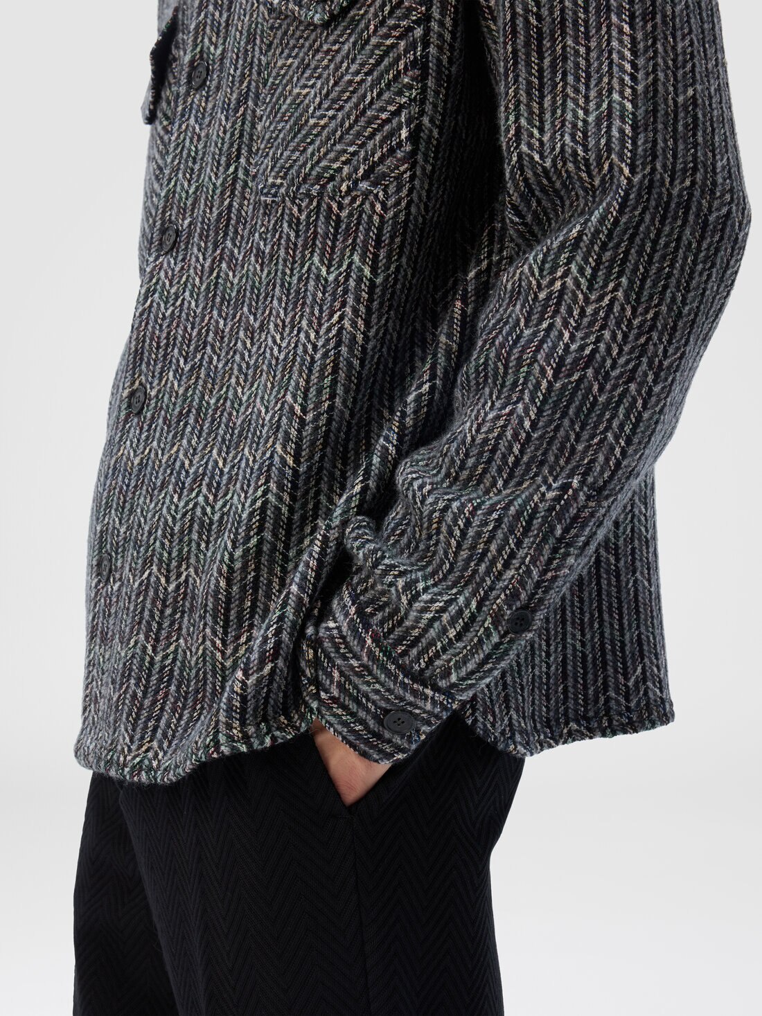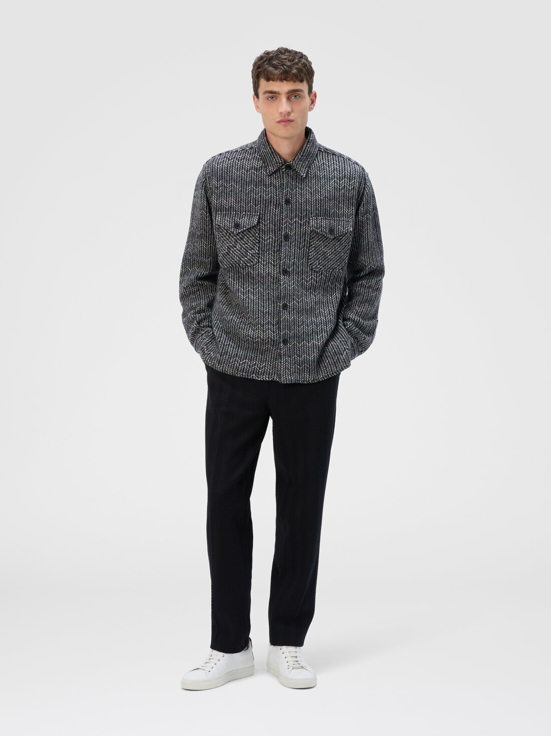 Surchemise homme à manches longues en maille de laine et coton haut de gamme, travaillée sur métier à tisser, et embellie du célèbre motif zigzag Missoni. Une pièce qui allie fonctionnalité et style, reflet de l'identité artisanale et graphique de la maison.