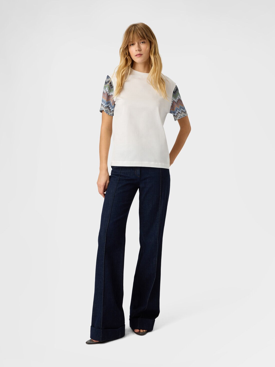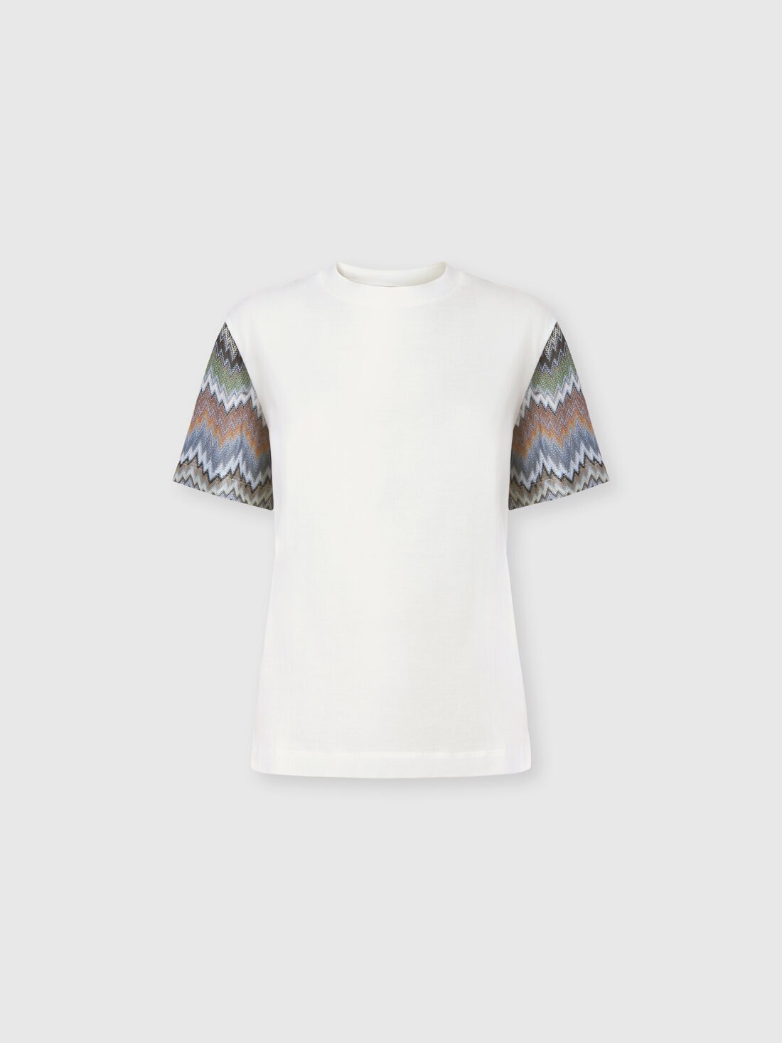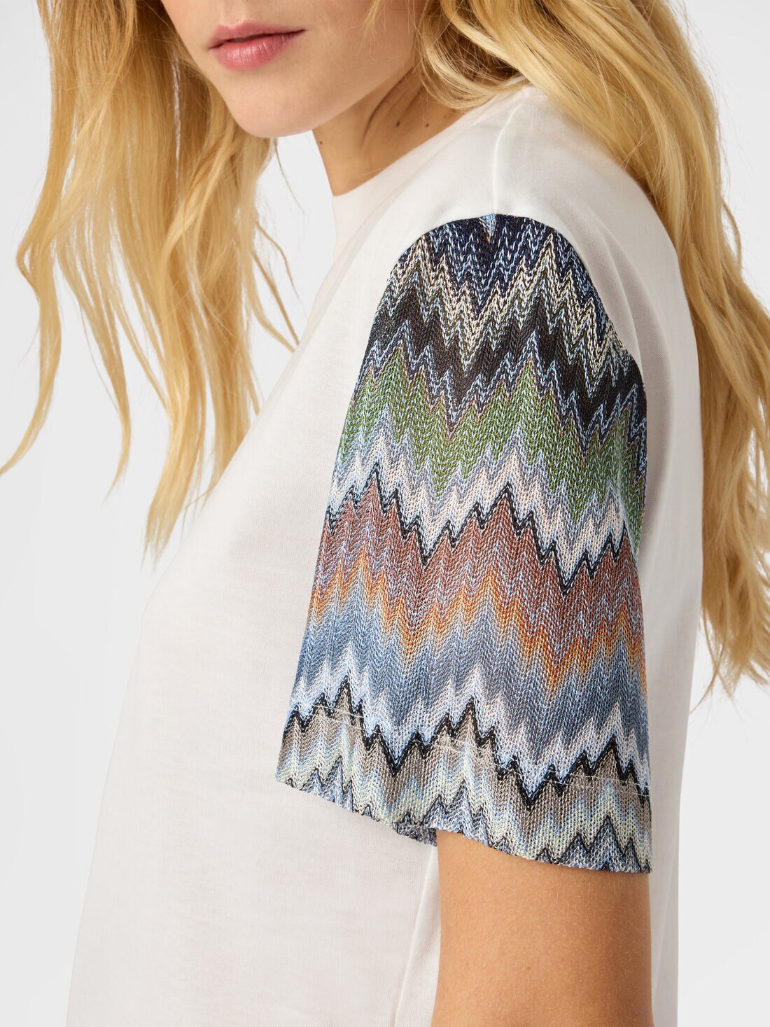 T-shirt pour femme à col rond en jersey de coton avec manches contrastées en maille raschel à motif serpent. Un modèle qui allie esprit contemporain et savoir-faire artisanal typique du style Missoni.