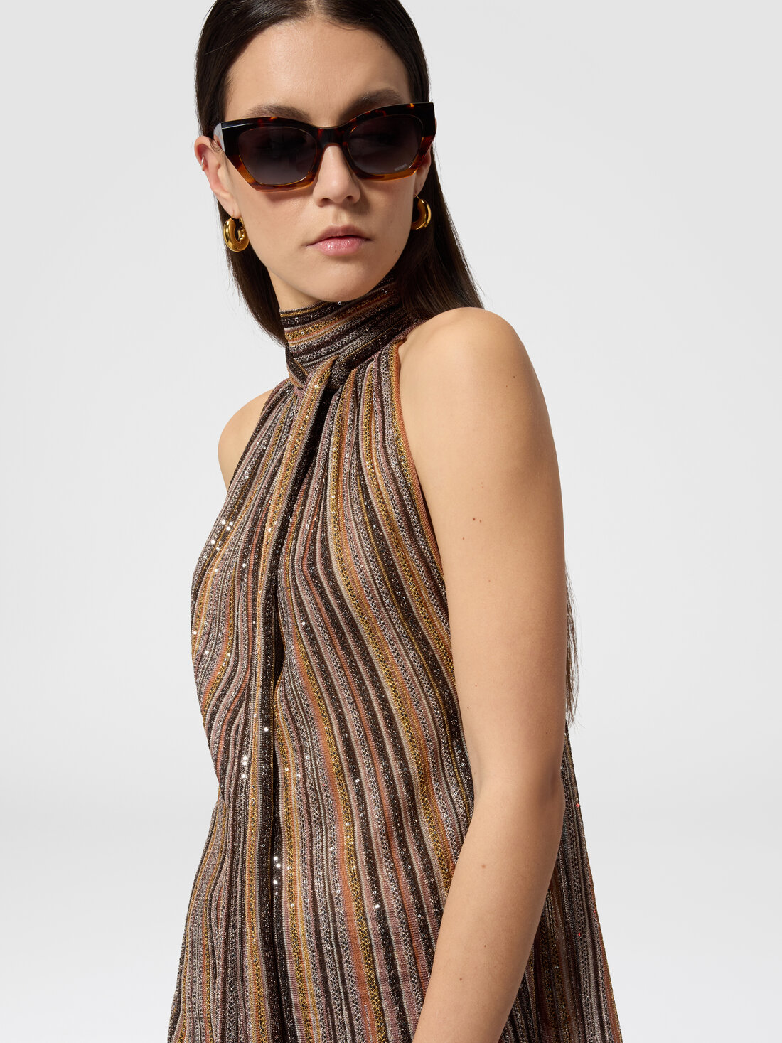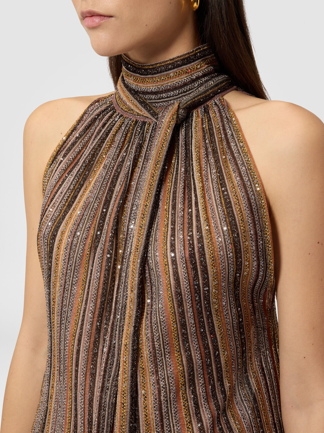 Entre transparences lumineuses et jeux de reflets, ce top sans manches pour femme en viscose lamé côtelée incarne l’expression raffinée de Missoni. Le col foulard ajoute une touche fluide et sophistiquée.