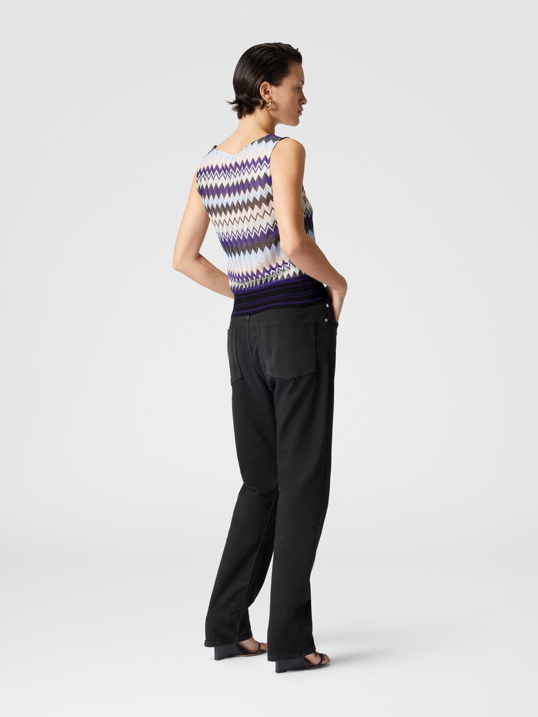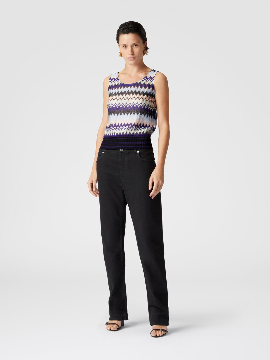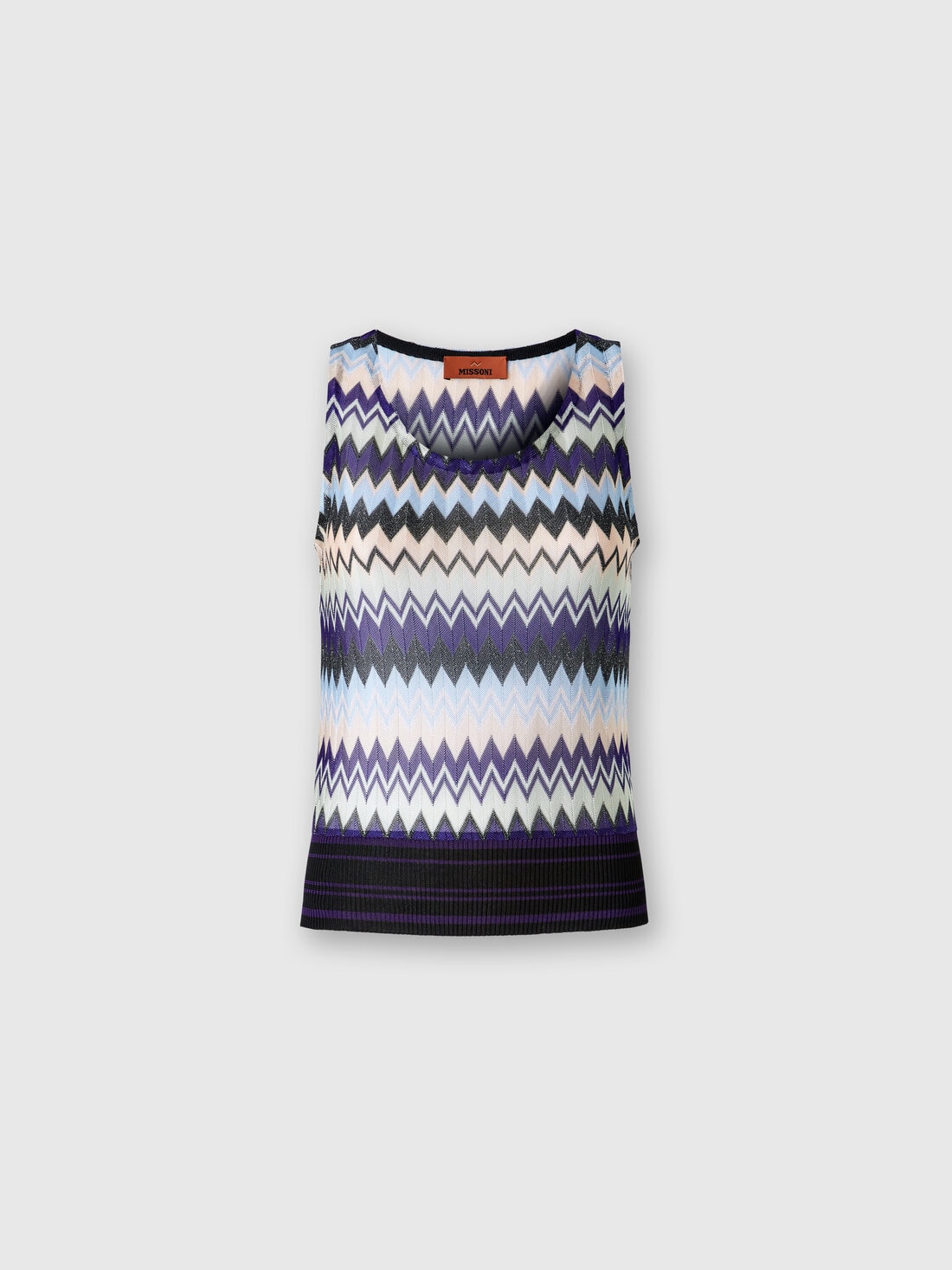 Finitions côtelées contrastées et encolure arrondie pour le haut sans manches en viscose en maille raschel, rehaussé par le motif lamé en zigzag.