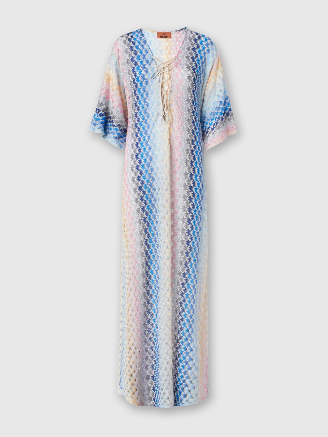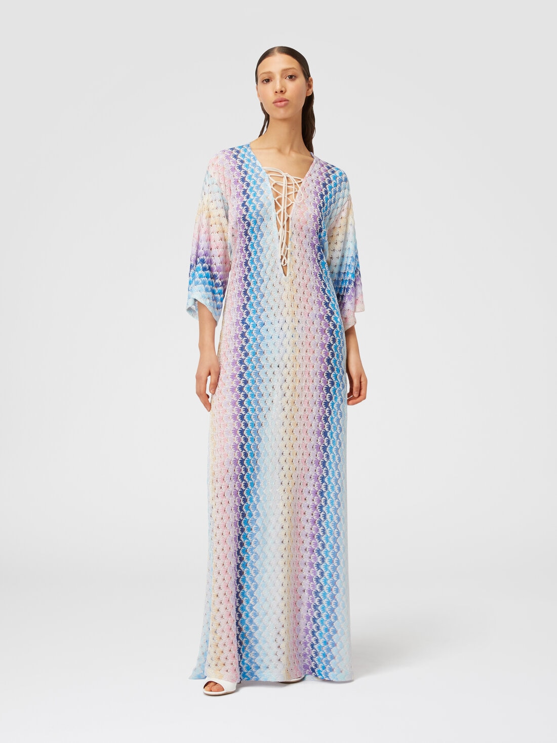 L'accent est mis sur le décolleté dans ce long caftan pour femme, caractérisé par un généreux décolleté en V traversé par le cordon tressé. Confectionné en viscose dégradée avec un effet de dentelle lurex, ce modèle présente des manches trois-quarts et de profondes fentes latérales.