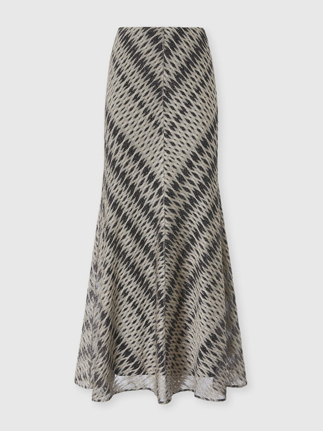 Une pièce d’une grande sophistication matérielle, où la lumière et la tridimensionnalité se fondent dans l’élégance inimitable de Missoni : cette jupe longue évasée pour femme en mélange de viscose présente un motif losange en lamé réalisé en maille raschel 3D, expression d’un savoir-faire artisanal raffiné.