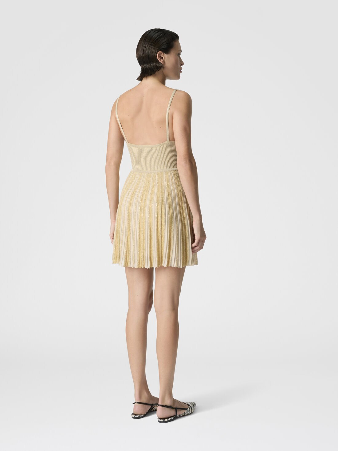 Des lignes contemporaines et une texture lumineuse définissent cette mini-robe pour femme en viscose lamé côtelé ton sur ton. Sans manches et ornée de paillettes, le détail cut-out confère au modèle une allure moderne et distinctive, signature de Missoni.