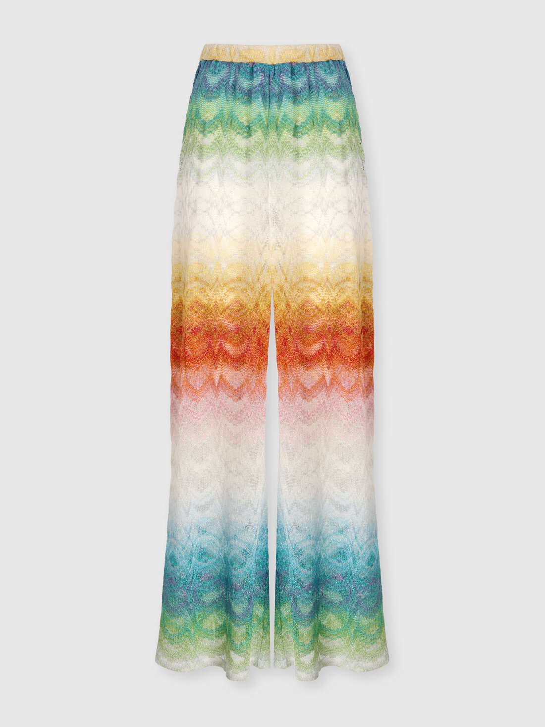 Un jeu de nuances et de transparences définit ce pantalon de plage pour femme en viscose lamé dégradée, où l’éclat du fil et la légèreté du tissu se fondent dans un équilibre d’élégance et de mouvement.