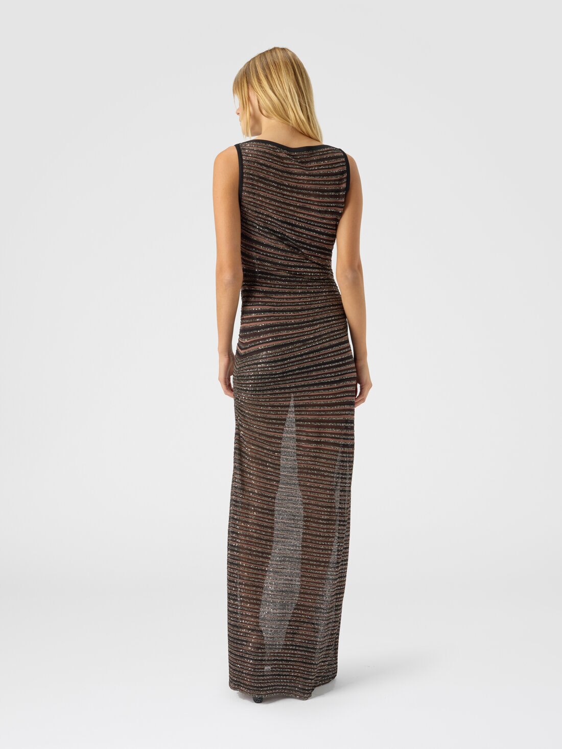 Élégance sophistiquée et raffinement moderne se rencontrent dans cette robe longue pour femme à encolure bateau. Le tricot rayé en mélange de viscose, enrichi de fils lamés et de paillettes, capte discrètement la lumière pour créer un effet lumineux qui enveloppe la silhouette. Une robe alliant modernité et classe, idéale pour une allure élégante et saisissante en toute occasion.