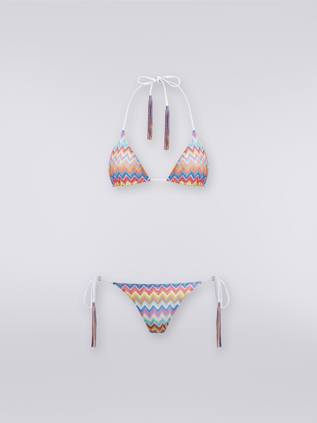 Le bikini à imprimé zigzag a toujours été un classique estival de la garde-robe pour femme. La culotte réglable offre confort et flexibilité, tandis que le haut triangulaire est indémodable. Les lacets frangés ajoutent une touche d’élégance ludique, complétant ce design signé Missoni.