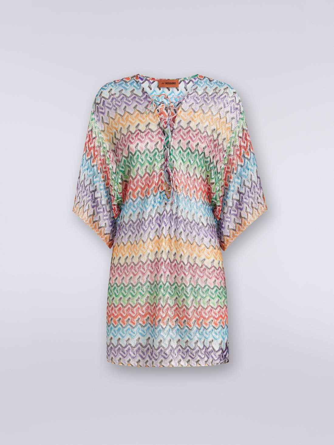 Il combine les attributs des vêtements de plage Missoni et l’élégance décontractée qui caractérise la marque en un seul vêtement, un maillot de bain pour femme. Les manches courtes et l’encolure à cordon de serrage ajoutent une touche de fantaisie à ce caftan court en maille viscose légère à effet dentelle.