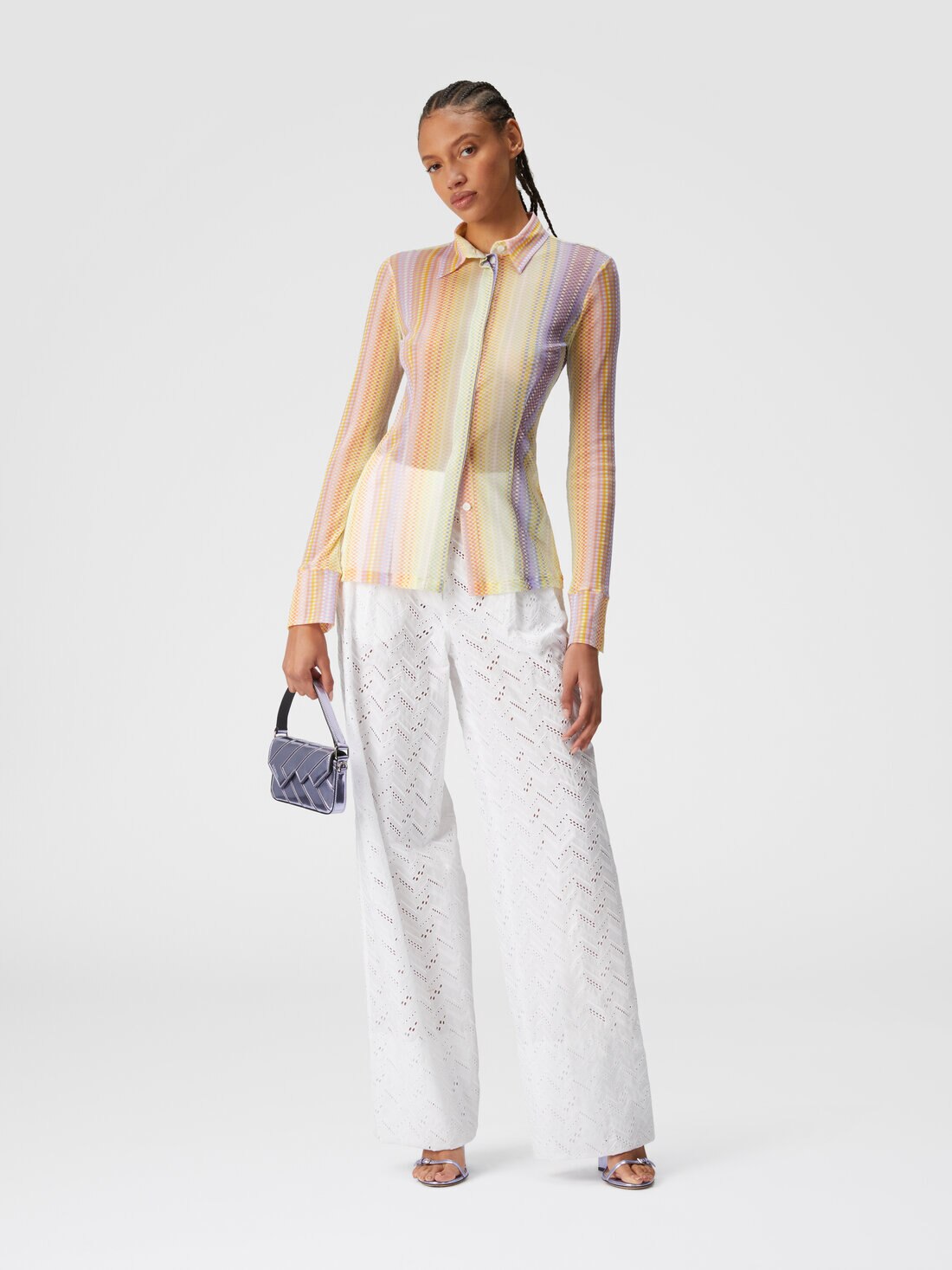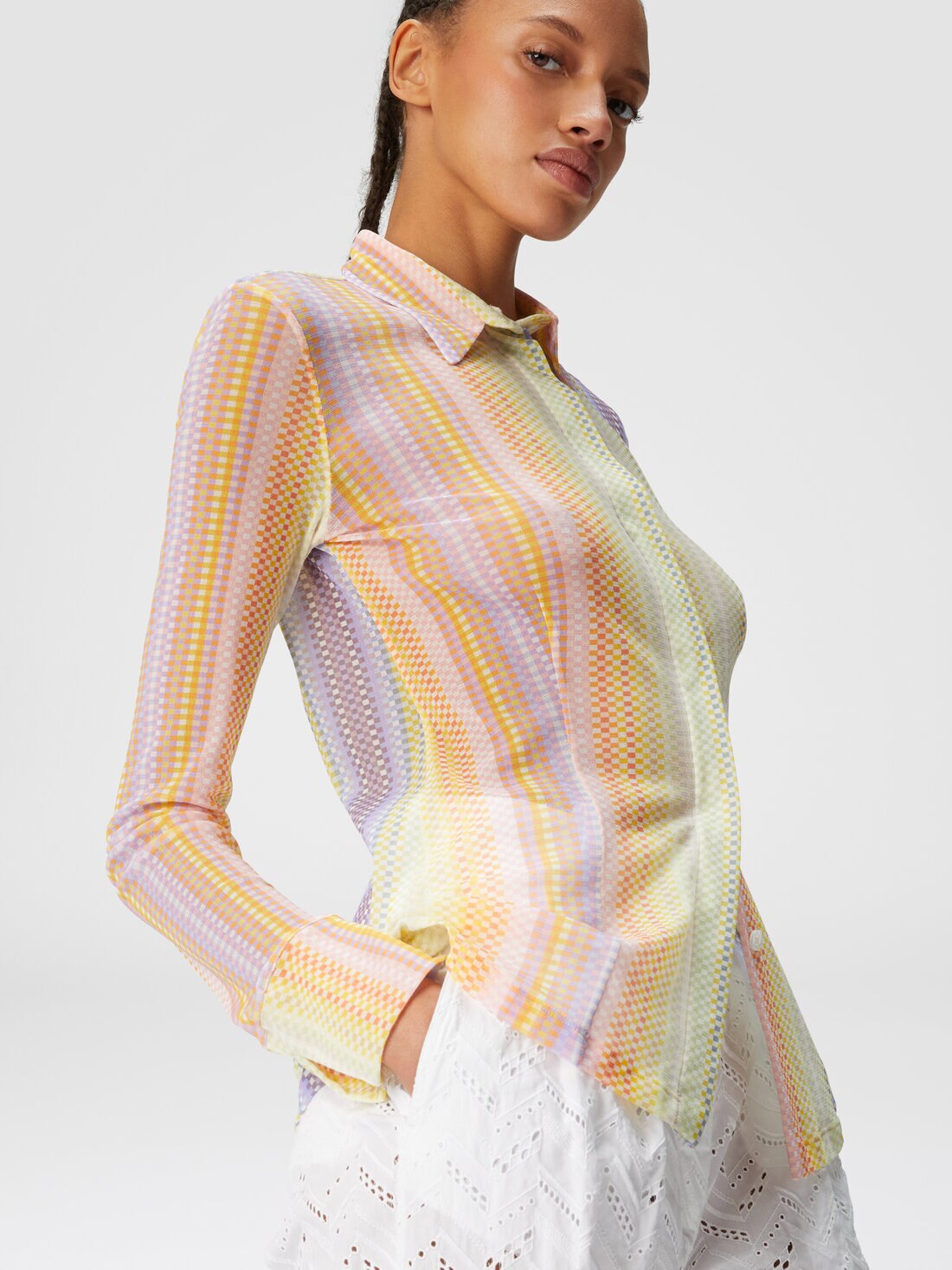 Cette chemise pour femme en tulle imprimée propose un look sophistiqué et valorisant. Avec sa coupe cintrée, cette chemise allie confort et style, grâce à sa confection élégante et à son tissu extensible qui s’adapte sans effort à la silhouette féminine.