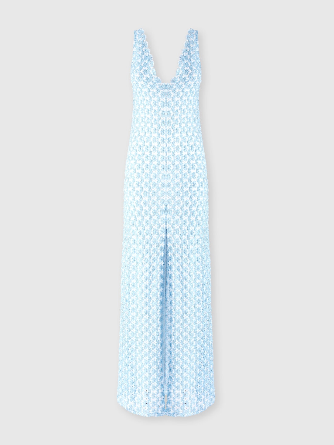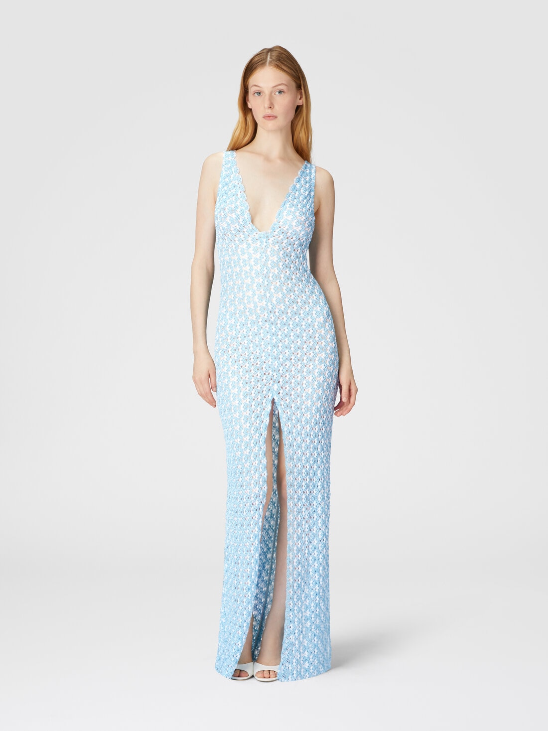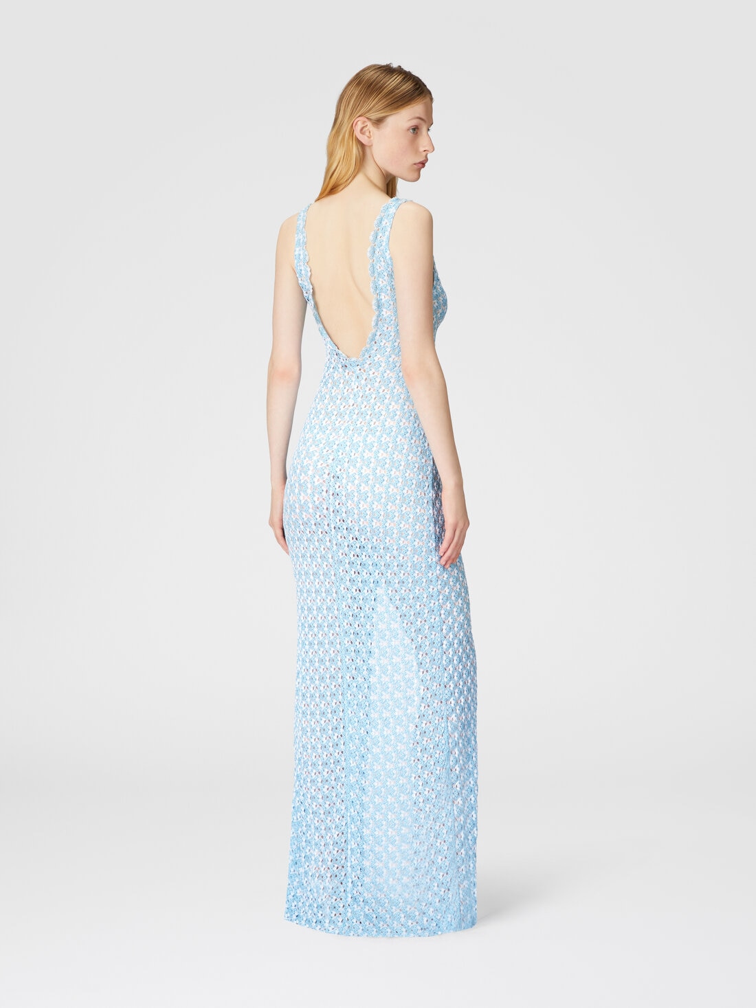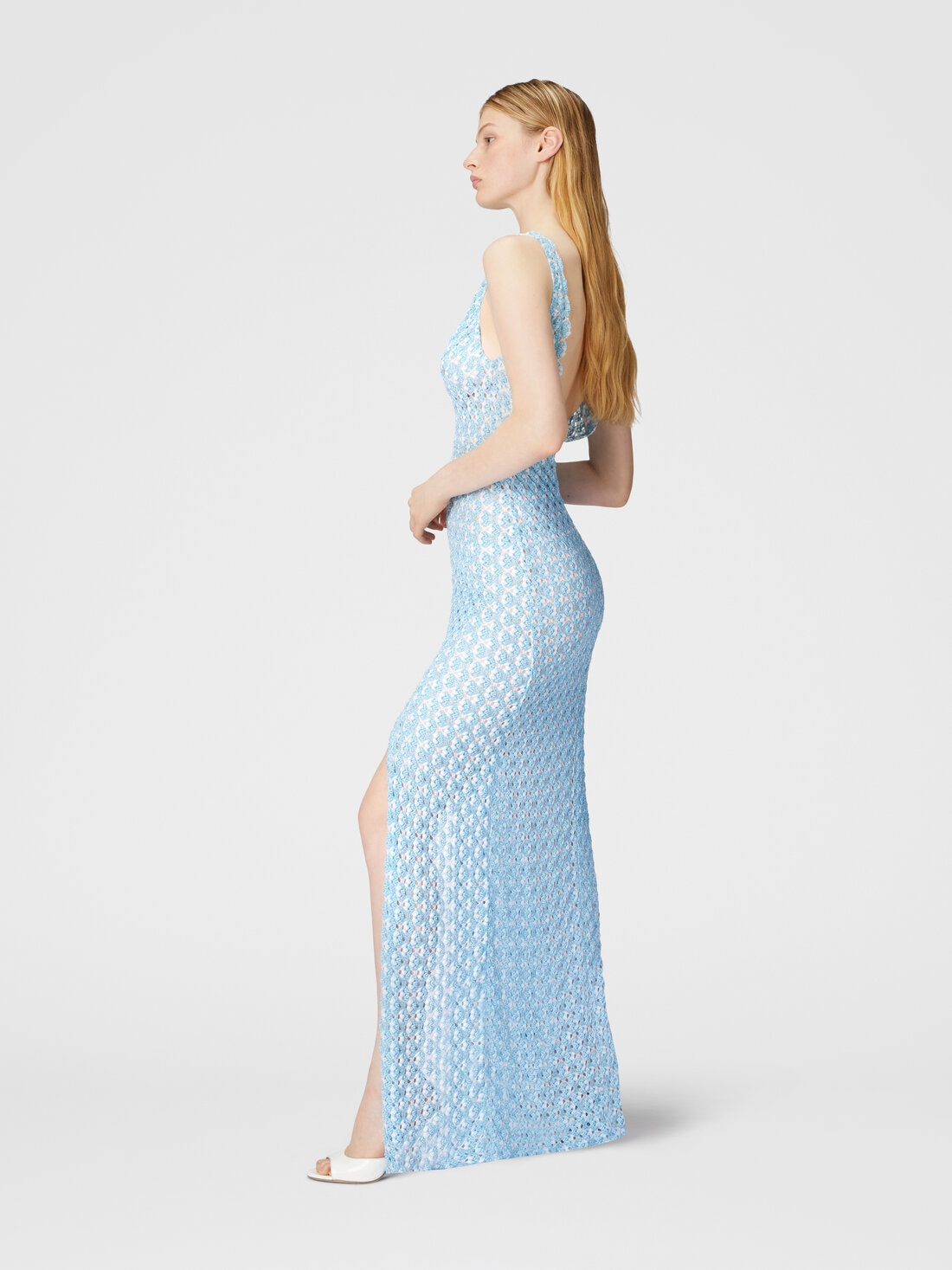 Sensible et élégant, le long cover-up présente un décolleté en V et un dos ouvert, réalisé en dentelle Raschel. L'effet transparent et la fente à l'avant de la jupe créent du mouvement et de la légèreté, ajoutant un attrait irrésistible.