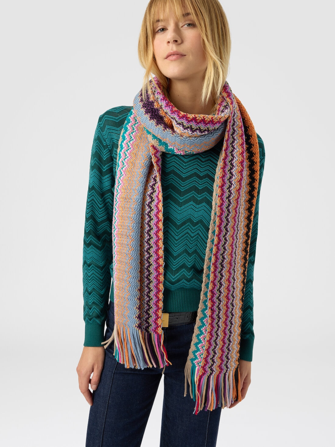 Accessoire emblématique du style Missoni, cette écharpe pour femme en pure laine avec franges présente le tricot caractéristique en chevron. Le motif graphique et la douceur du tissu créent un équilibre parfait entre chaleur, mouvement et raffinement, complétant élégamment chaque tenue.