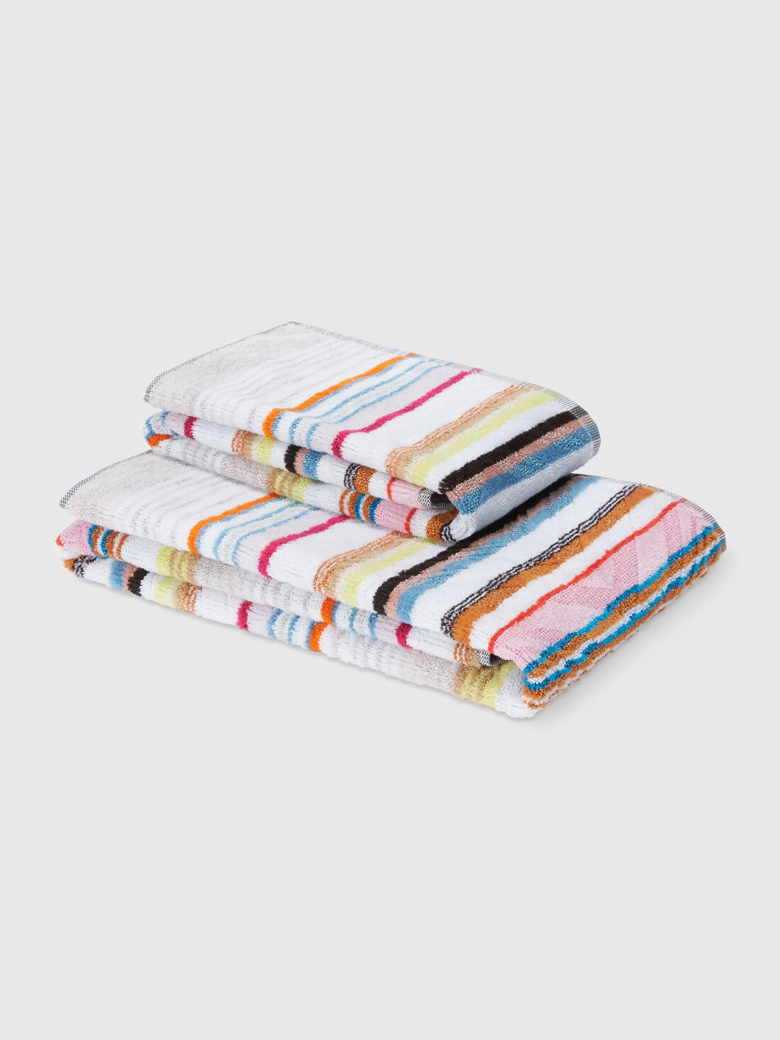 L’élégance s’invite dans le quotidien avec le set de serviettes Moonshadow. Composé de deux pièces, l’ensemble est fabriqué en velours de coton éponge de haute qualité, rehaussé de fins fils de lurex. Le motif rayé, agrémenté d’un fin liseré jacquard, confère une touche de luxe et de sophistication à la salle de bains, alliant fonctionnalité et style dans une création unique de MissoniHome.