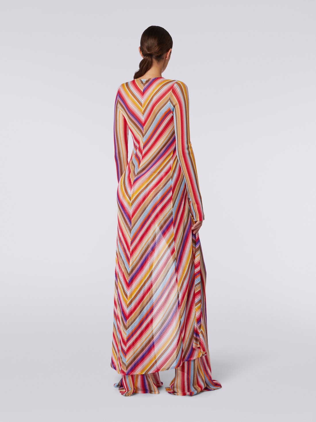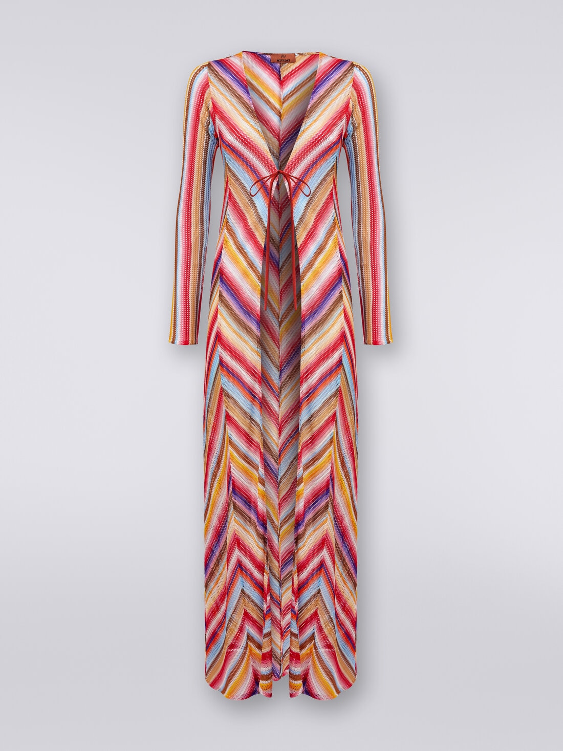 Version revue et corrigée du procédé du patchwork auquel Missoni a contribué le premier, ce long cardigan de plage pour femme est réalisé en maille de viscose crochetée avec un motif rayé, et composé par l'assemblage de bandes de tissu dont l'orientation des rayures génère un effet d'optique original.