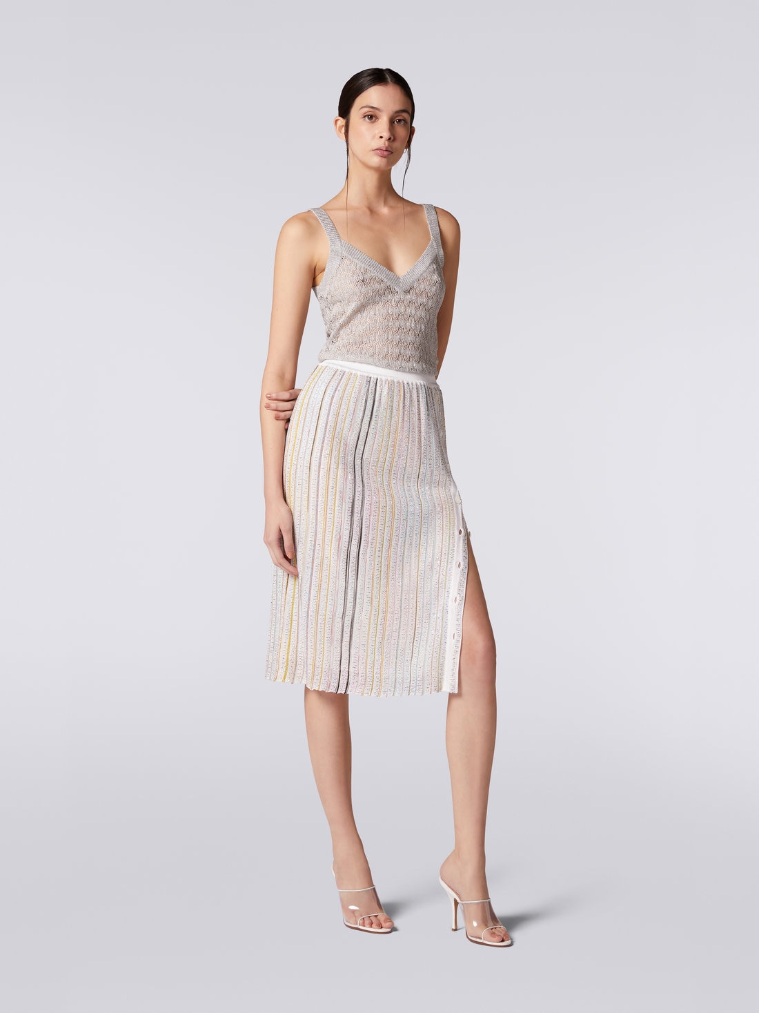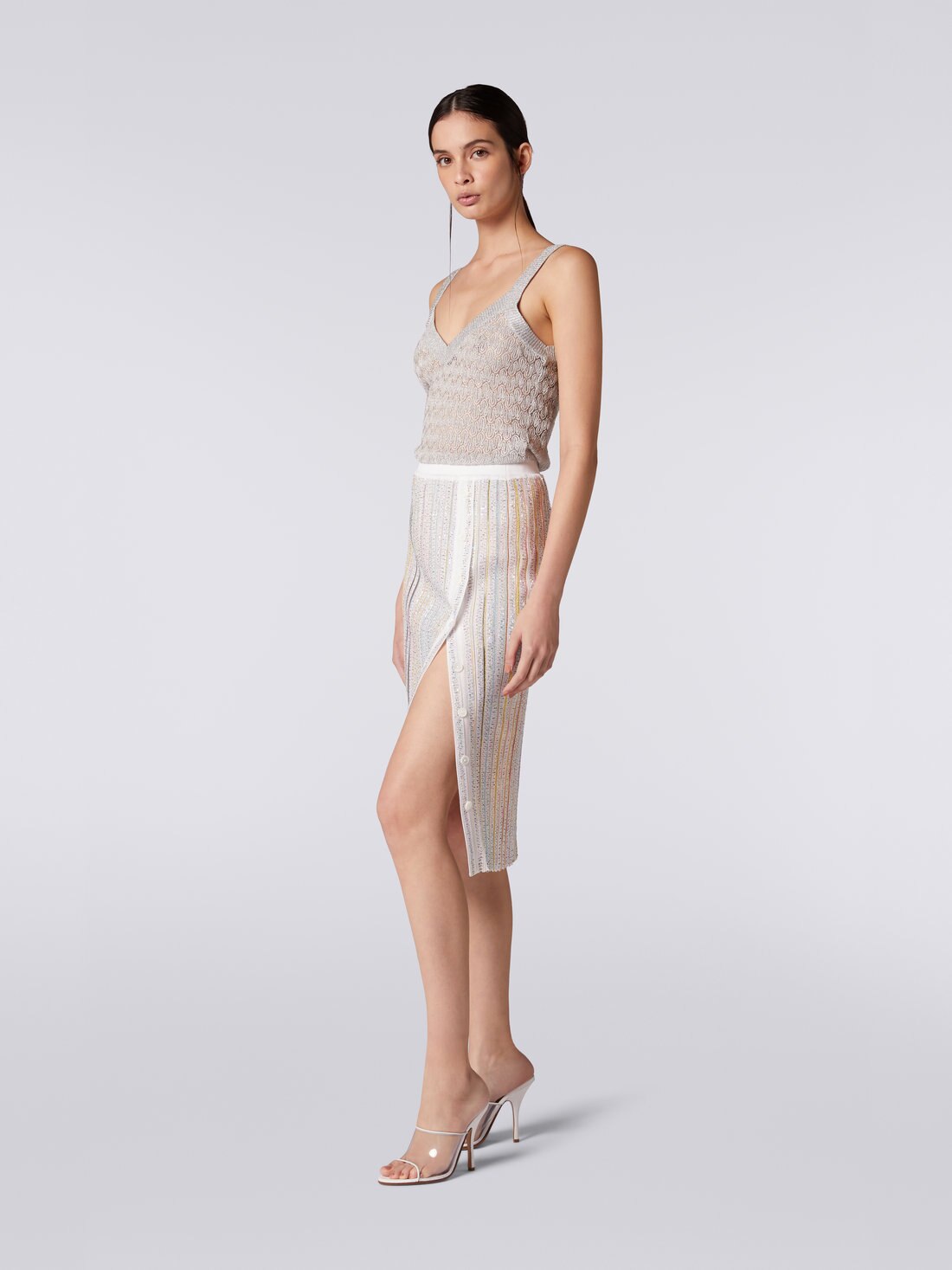 Rendue sensuelle par la fente latérale modulable à volonté grâce aux boutons qui la bordent, cette jupe longuette pour femme joue sur l'effet 3D de la finition côtelée, d'où émergent les rayures multicolores ornées de paillettes.