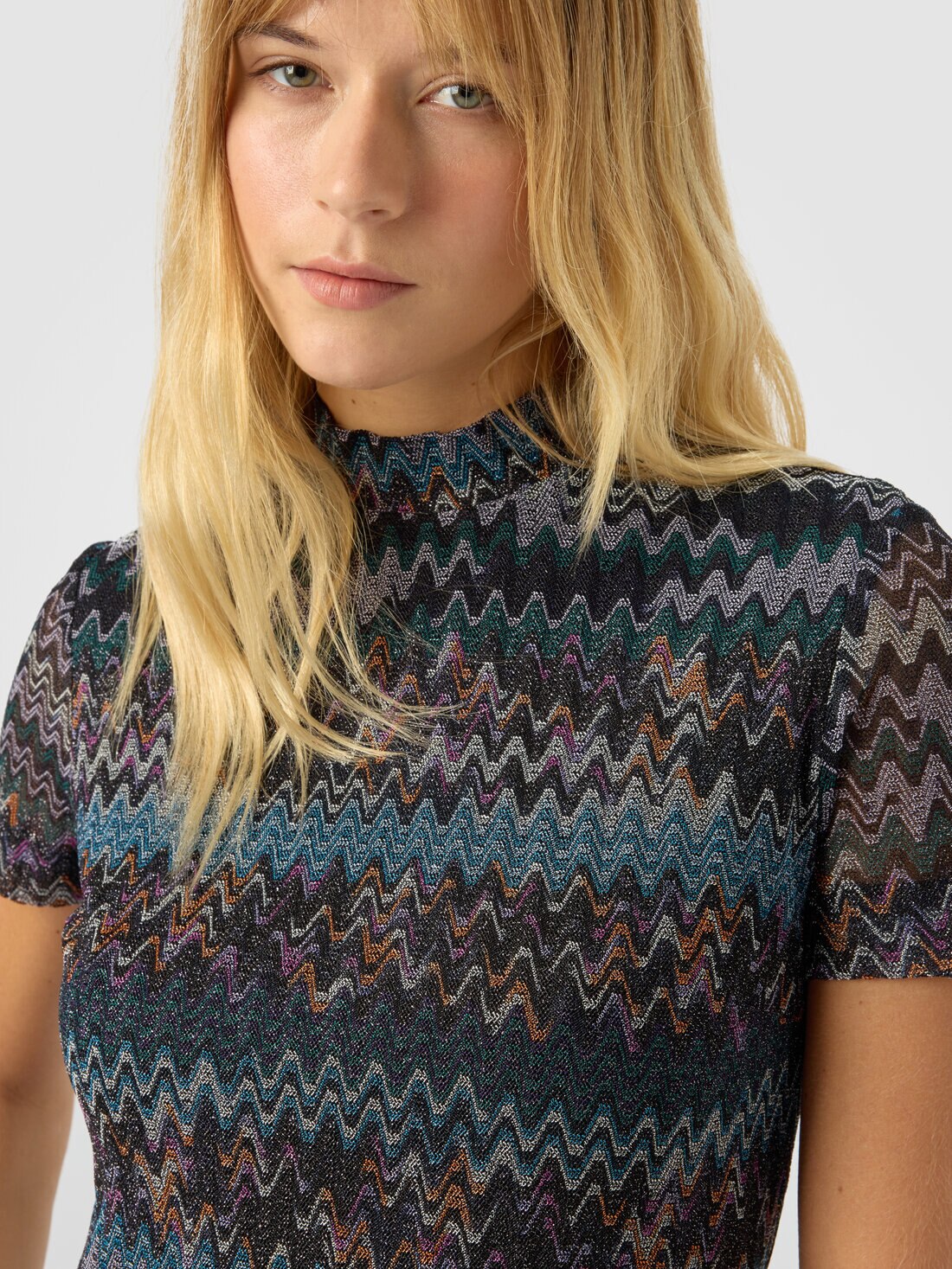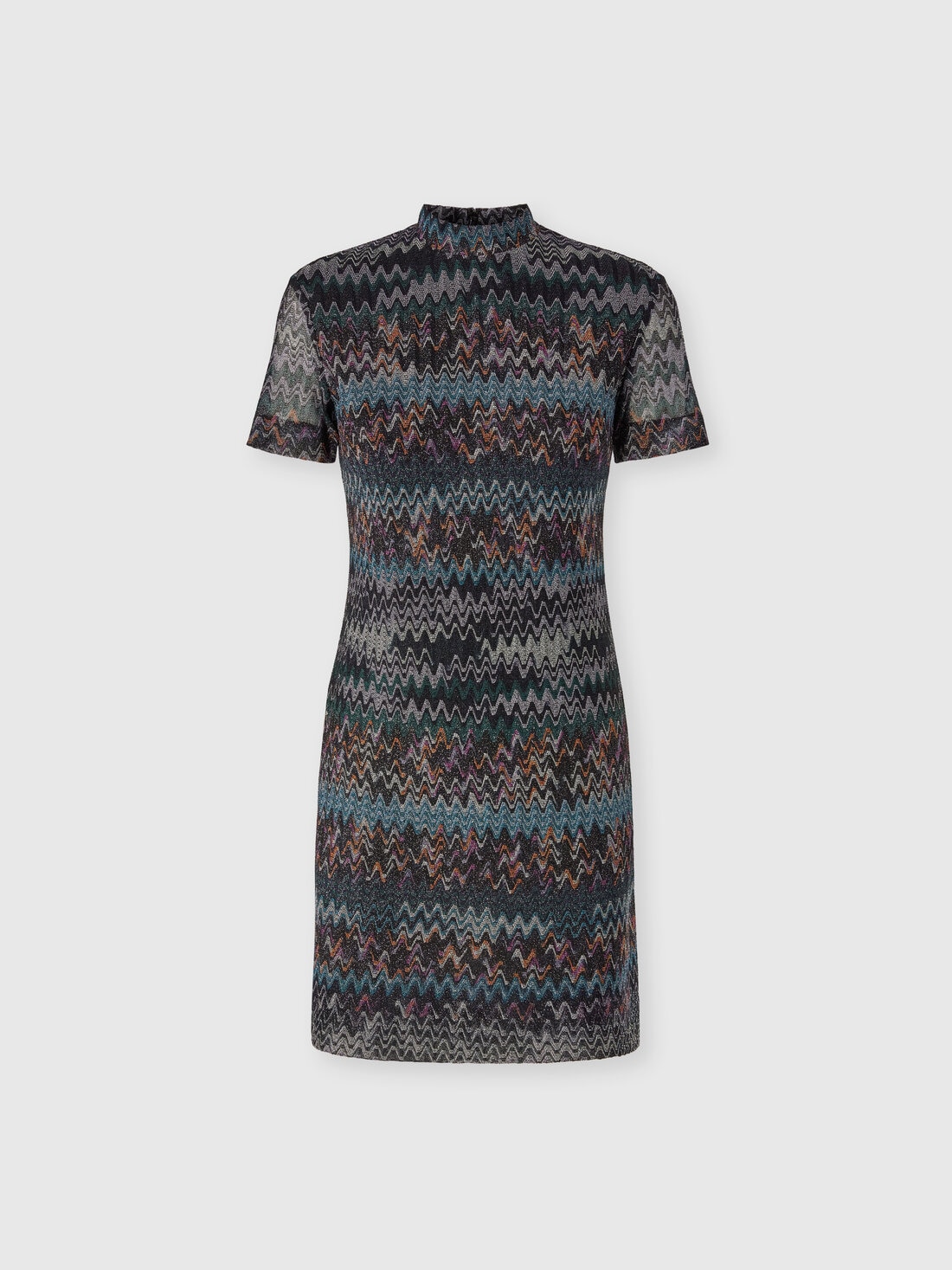 Une mini-robe pour femme à col montant en viscose lamé, avec des manches courtes et un raffiné tricot raschel à motif chevron flammé. La luminosité du tissu et le jeu graphique de la trame créent du mouvement et de la profondeur, faisant de ce vêtement une expression de féminité élégante et affirmée.