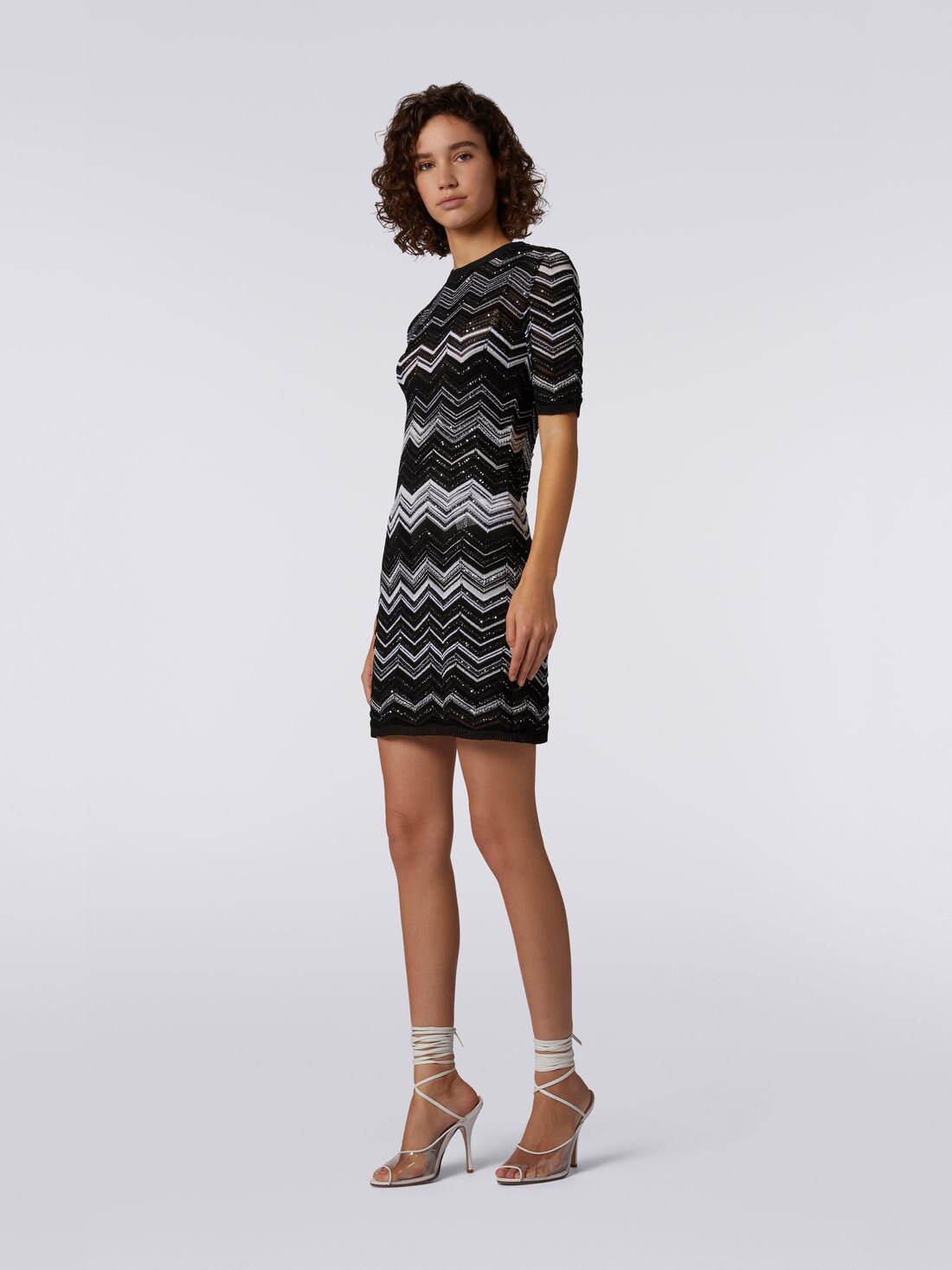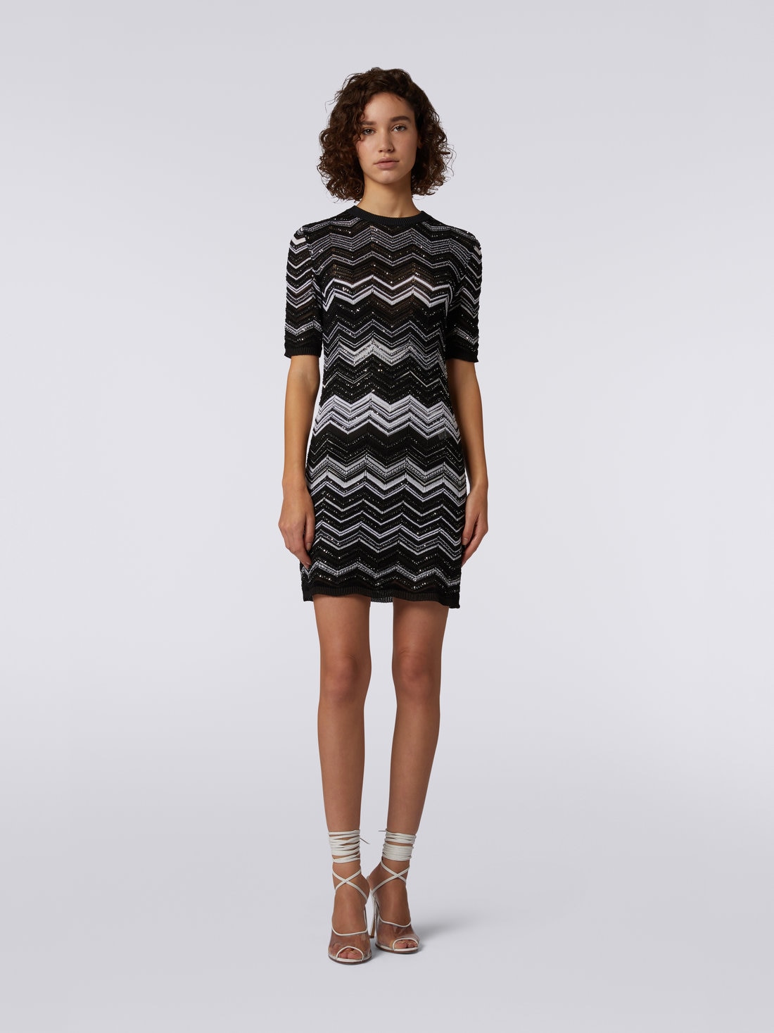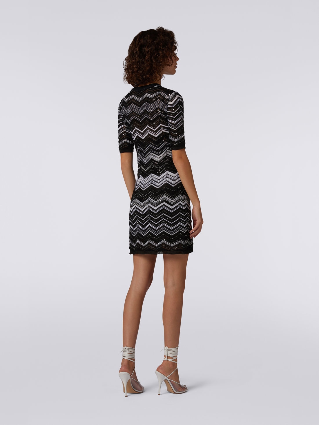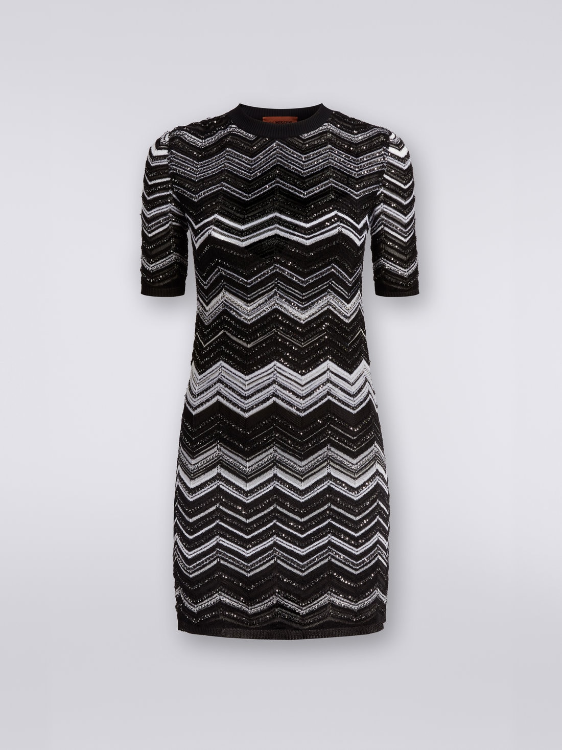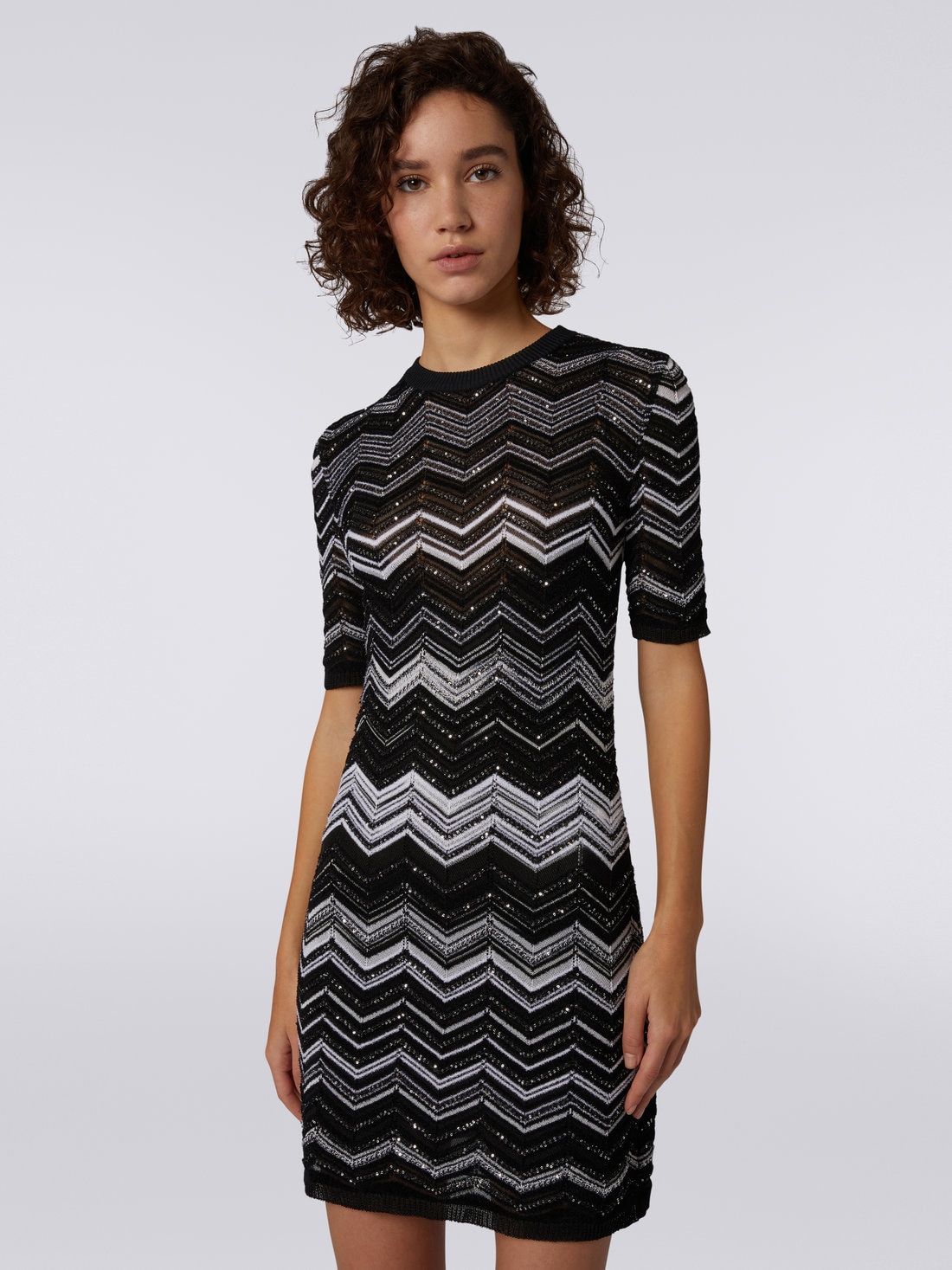 Illuminée par l'éclat lunaire des paillettes qui parcourent son motif chevron, cette mini-robe en maille de viscose pour femme souligne la silhouette en toute discrétion. Raffinement et reconnaissabilité au premier coup d’œil, garantis par la touche Missoni.