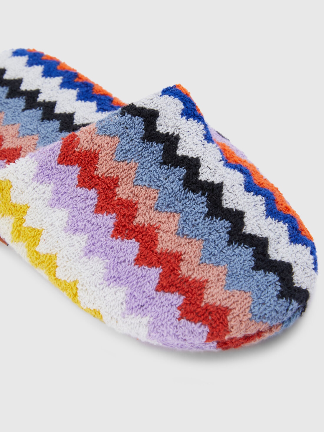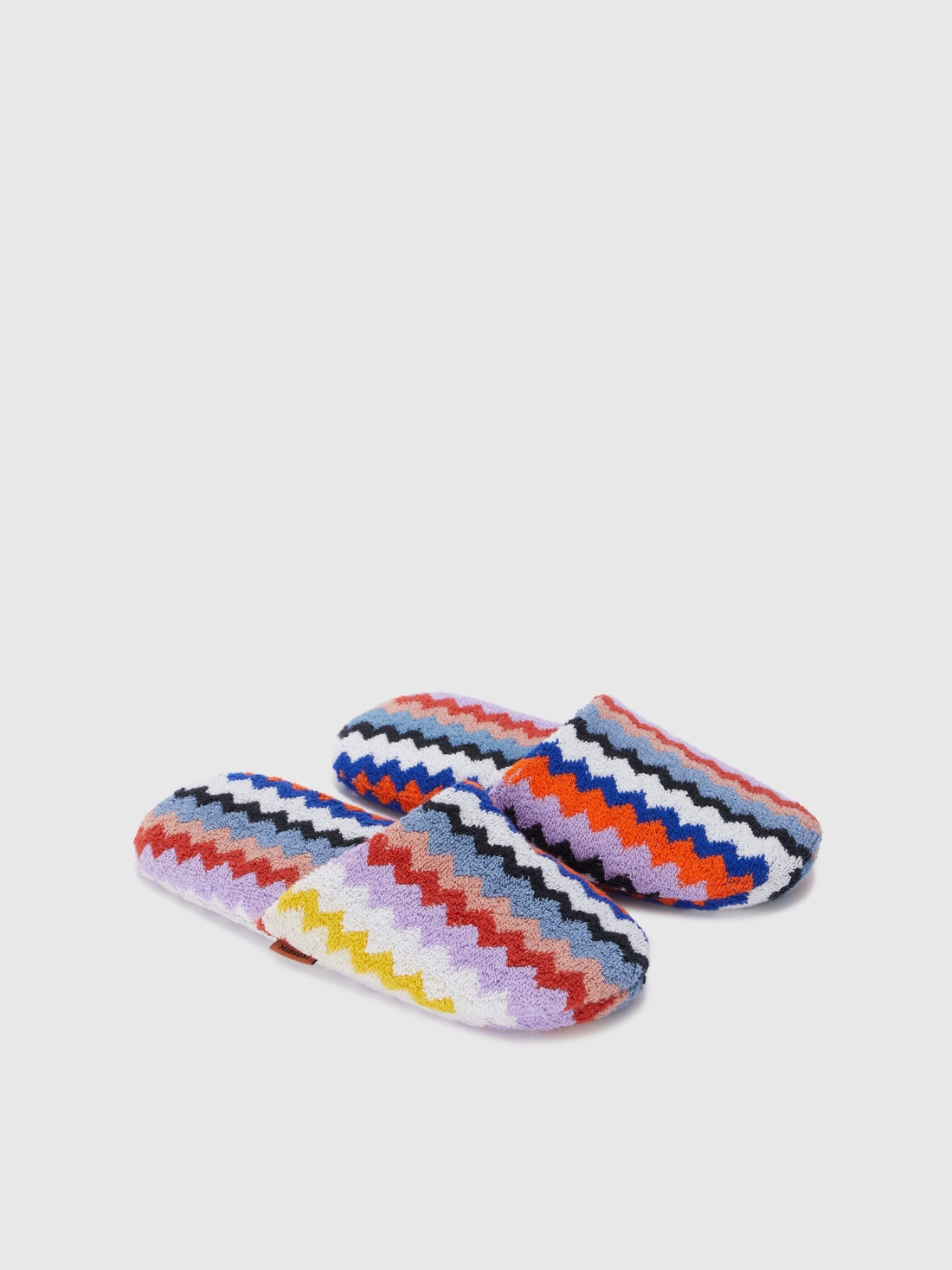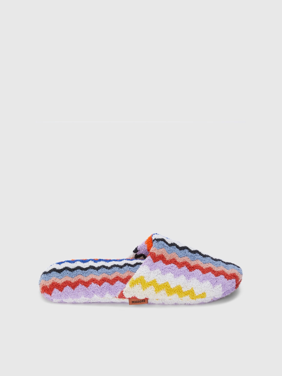 Les pantoufles Riverbero de Missoni, confectionnées en coton éponge doux, incarnent le confort et le style caractéristiques de la marque. Avec leur motif en zigzag, les pantoufles ajoutent une touche dynamique aux moments de détente à la maison. Complétées par une élégante étiquette avec logo, elles sont l’accessoire parfait pour rendre votre sommeil encore plus douillet et tendance.