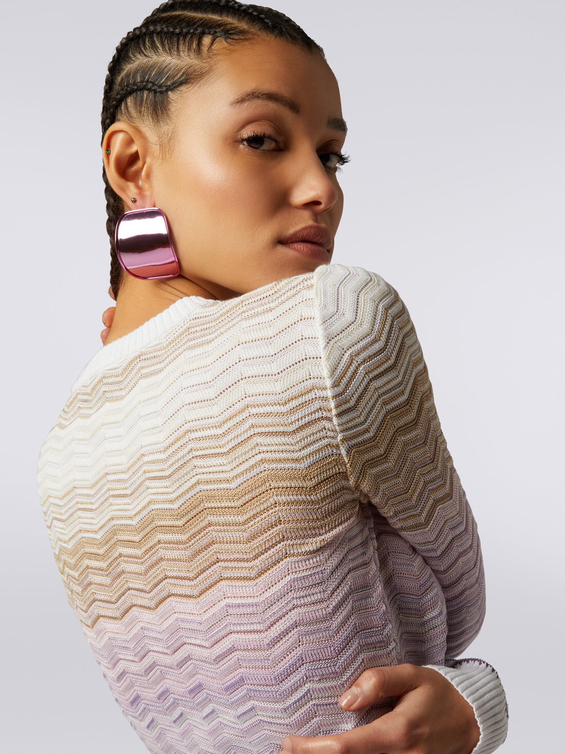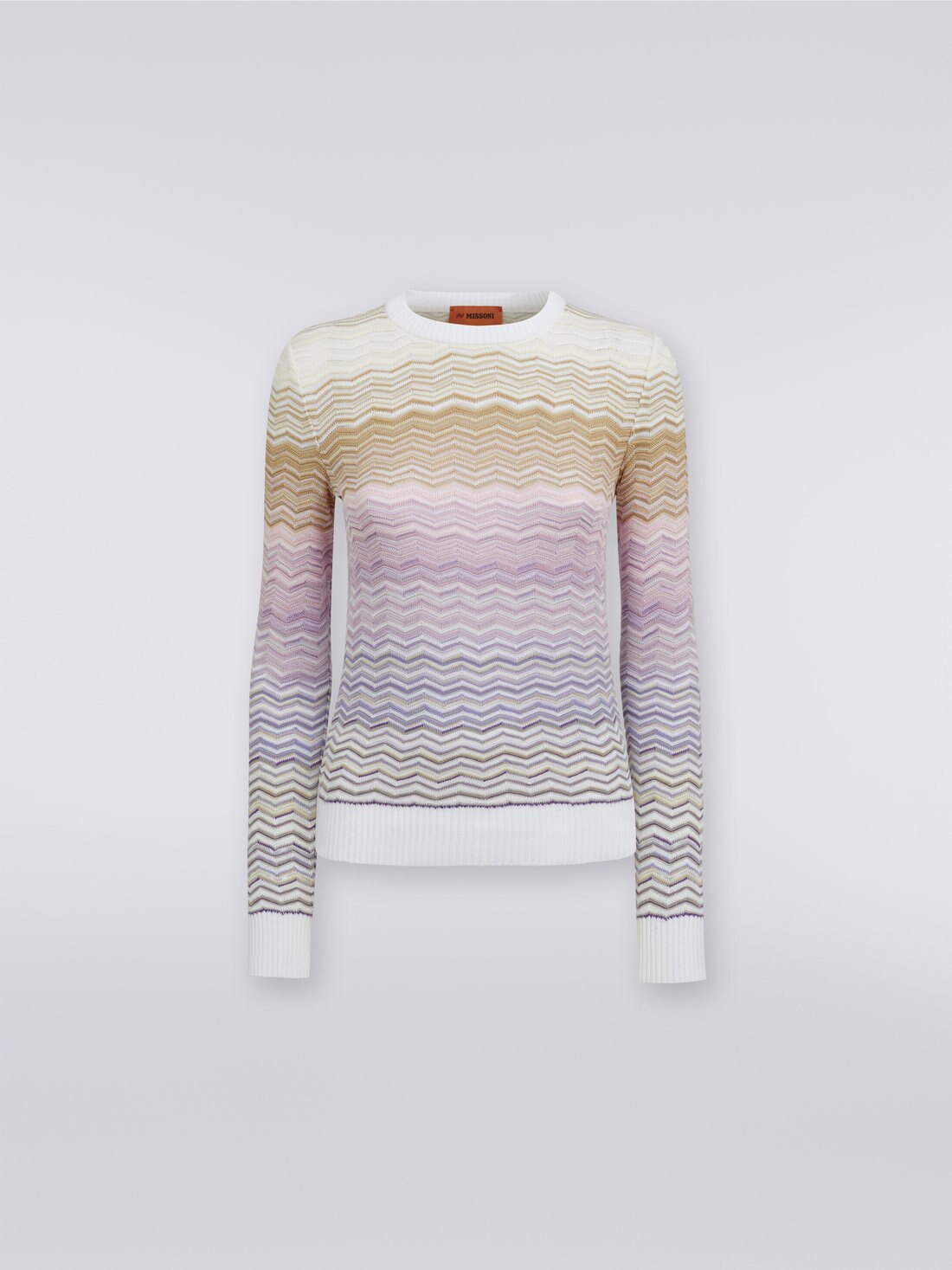 Animé par les zigzags dégradés, ce pull-over à col ras du cou pour femme est réalisé en maille de coton et viscose. Des bordures unies et contrastantes complètent le design du modèle.