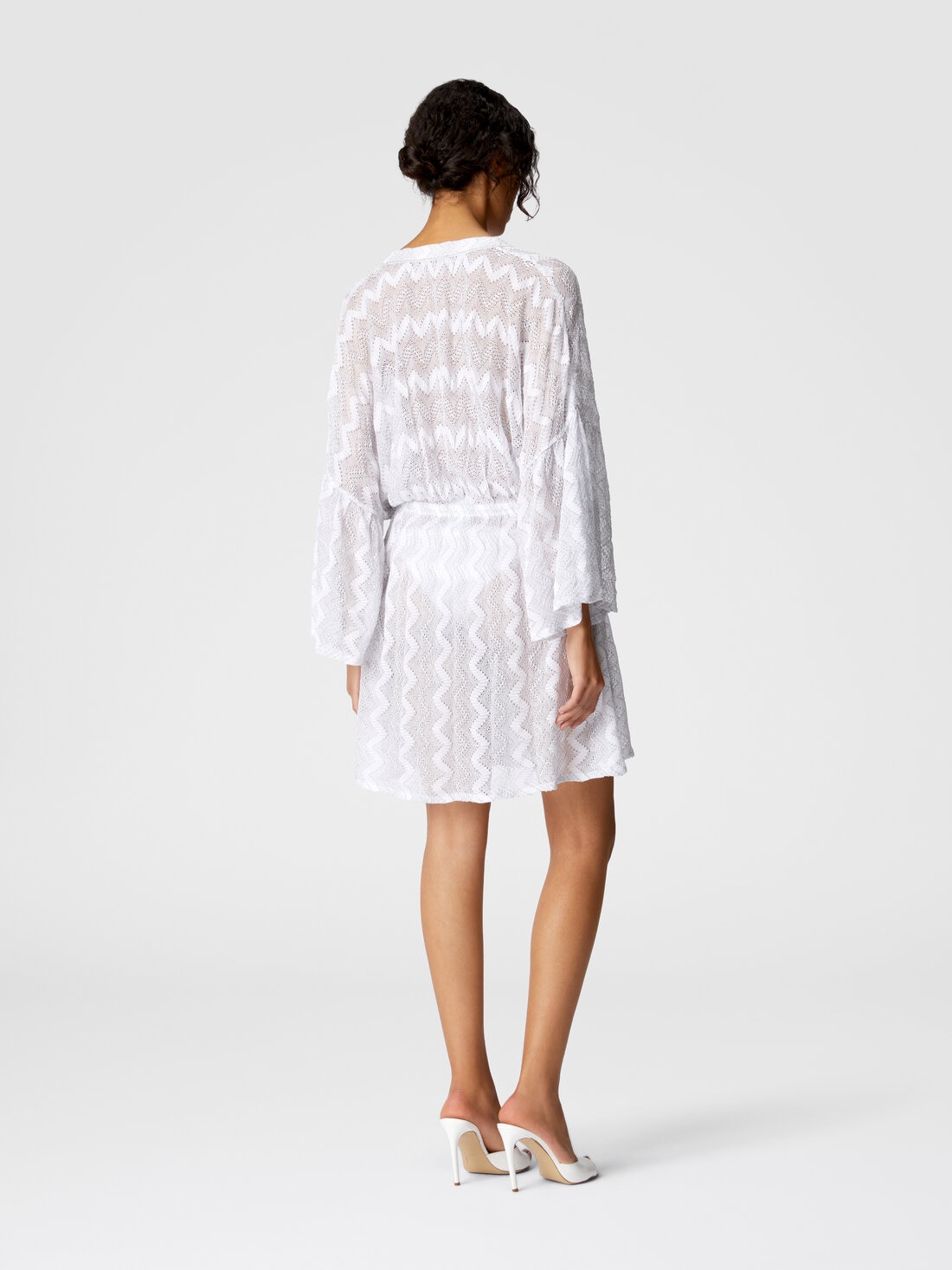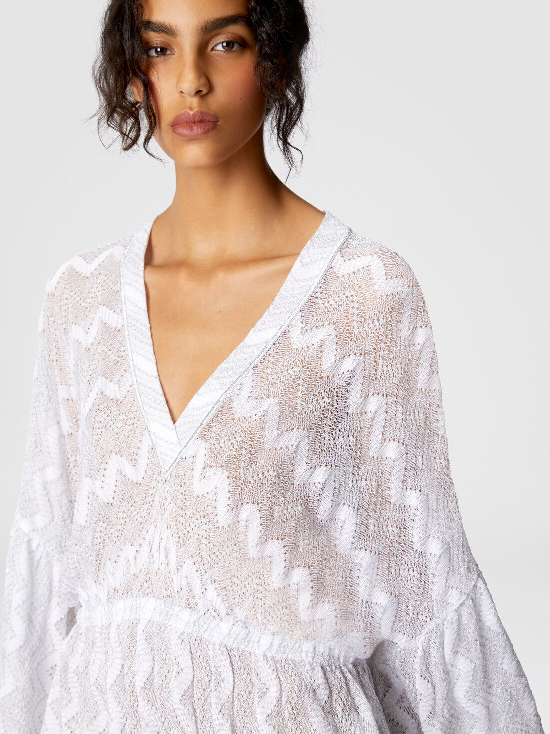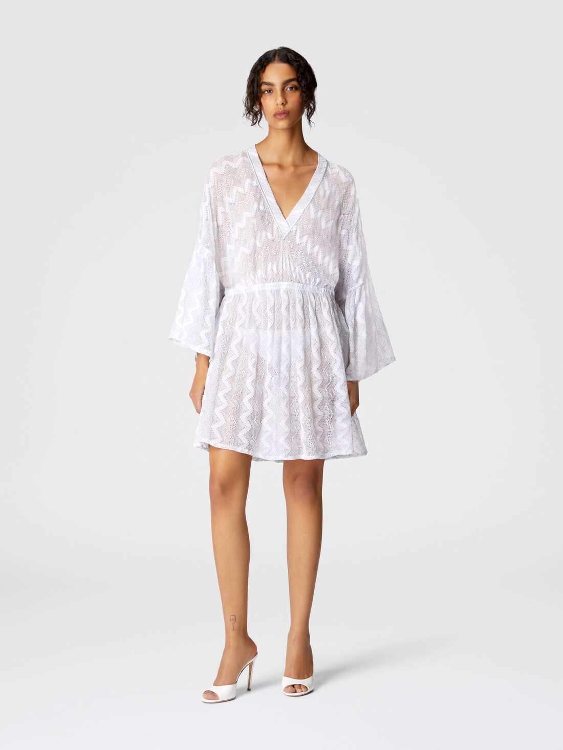 Le short cover-up en viscose lamée, signé Missoni, capture l'essence du boho chic avec une touche de glamour. Les manches larges et fluides se marient parfaitement avec le motif chevron classique, icône de la maison, évoquant une esthétique libre et vibrante.