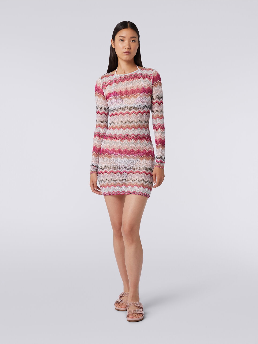 Maglia con lavorazione effetto crochet per l'abito copricostume da donna percorso dagli zig zag illuminati dal filo di lurex. Maniche lunghe e proporzioni ridotte caratterizzano questo modello girocollo, perfetto per dare un tocco raffinato al beach look.