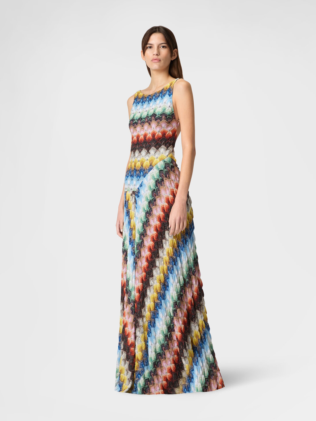 Un’eleganza eterea definisce questo abito lungo da donna, caratterizzato da una profonda scollatura posteriore e realizzato in lavorazione raschel in pizzo misto viscosa lamé. Una trama luminosa che avvolge la silhouette con sofisticata fluidità, esaltando lo stile in chiave contemporanea.