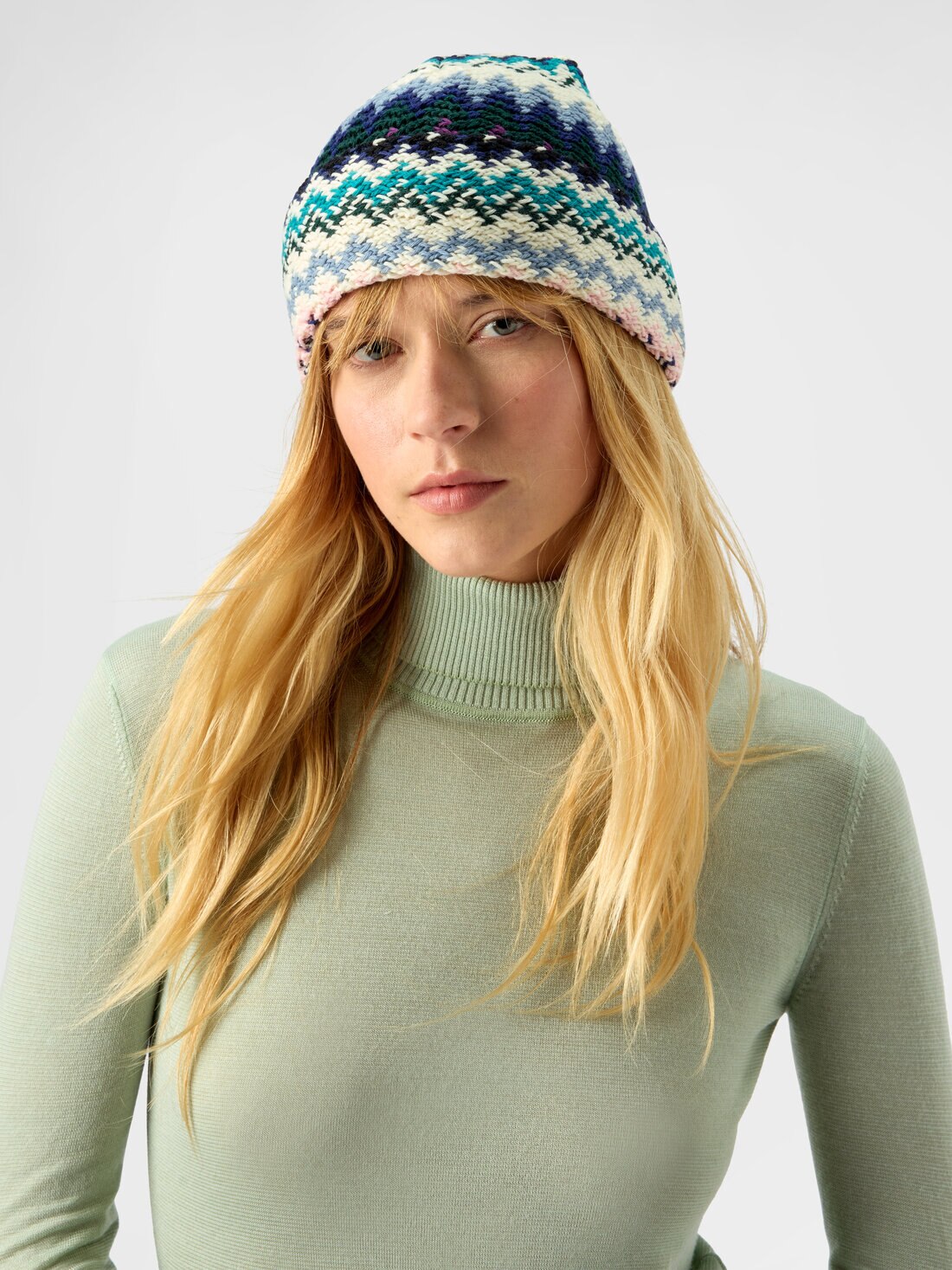 Un accessorio che riscalda al primo sguardo: ecco il cappello da donna in lana. Realizzato in un pregiato filato lavorato effetto hand made, e istoriato dal motivo zig zag, questo zuccotto con risvolto saprà personalizzare ogni look.