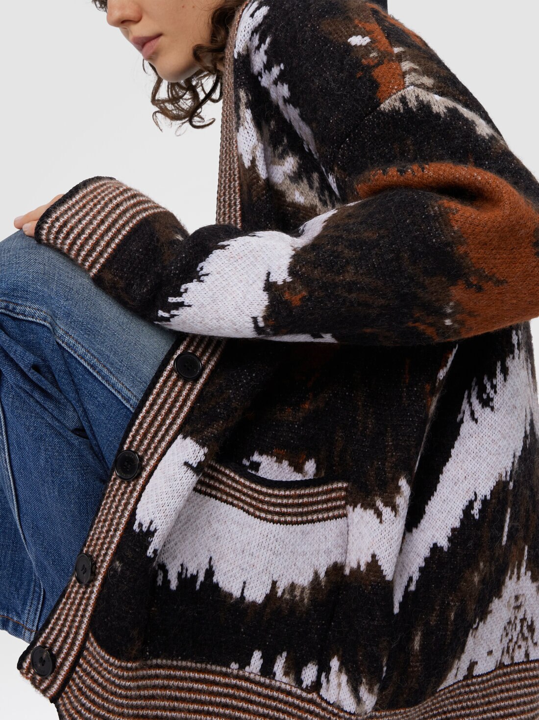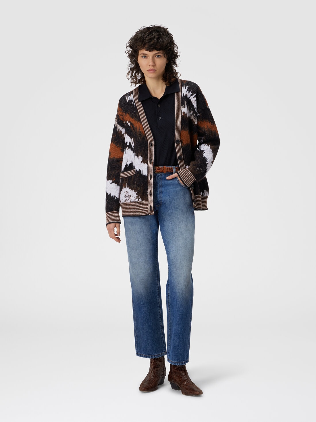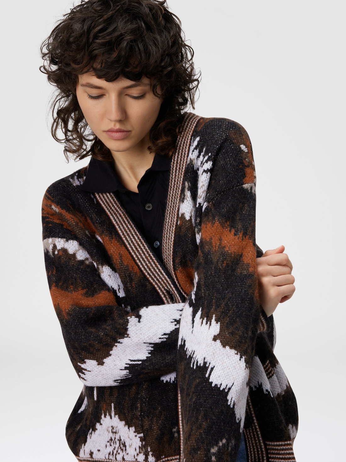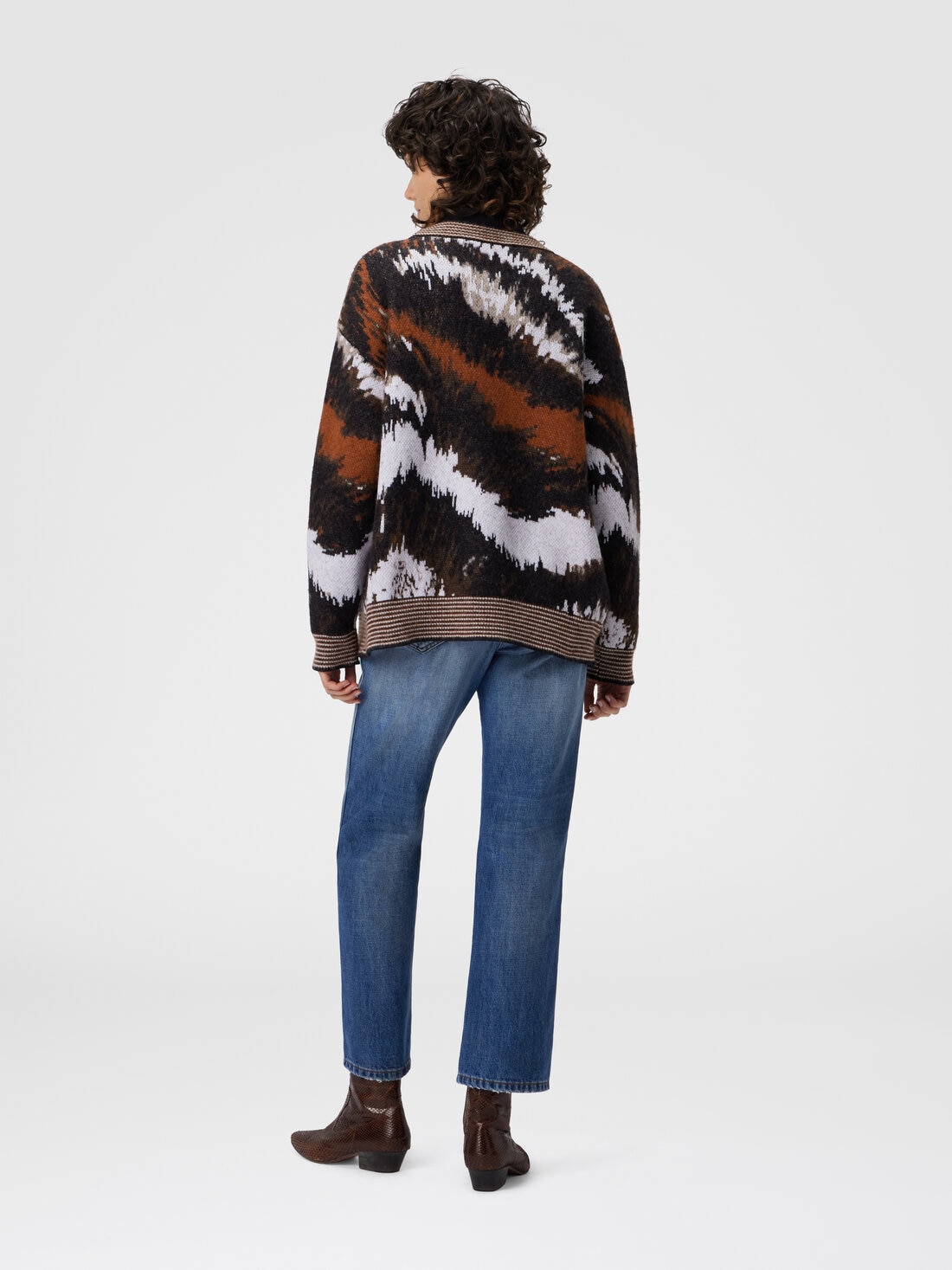 Espressione dell'artigianalità e della maestria distintiva di Missoni, questo cardigan oversize con bottoni da donna è realizzato in maglia jacquard in misto alpaca, caratterizzato da un pattern tigrato. La ricercatezza dei materiali e la lavorazione artigianale conferiscono al capo una texture morbida e calda, mentre il motivo animalier aggiunge un tocco di audacia e originalità.