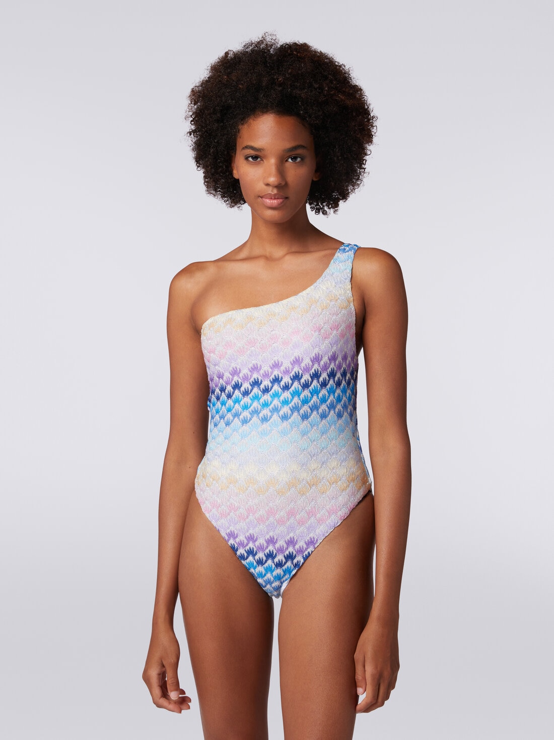 La lavorazione effetto pizzo che digrada, spandendo i bagliori dorati del lurex, anima la superficie del costume intero da donna monospalla in maglia di viscosa. Un modello che alla raffinatezza della fantasia unisce la praticità del design, sgambato e confortevole.