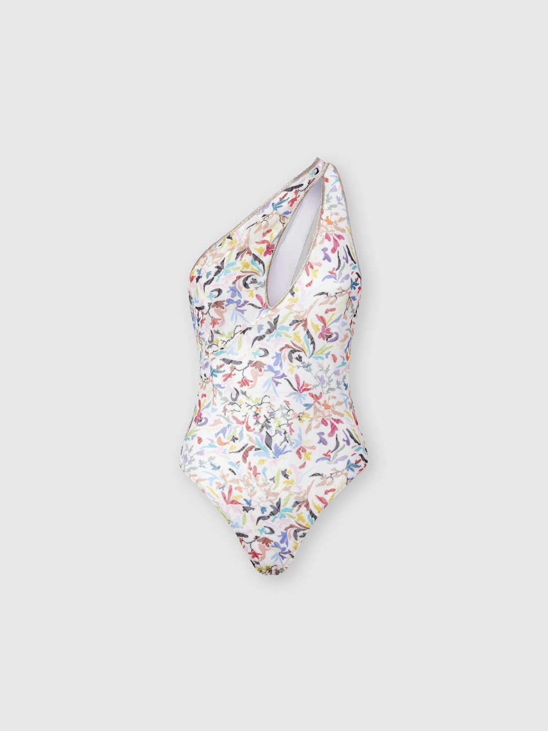 Questo costume intero monospalla da donna in tulle presenta una lavorazione raschel e stampa ramage ed è impreziosito da un cut-out sul davanti che valorizza il décolleté e da una schiena scoperta che ne esalta la femminilità.