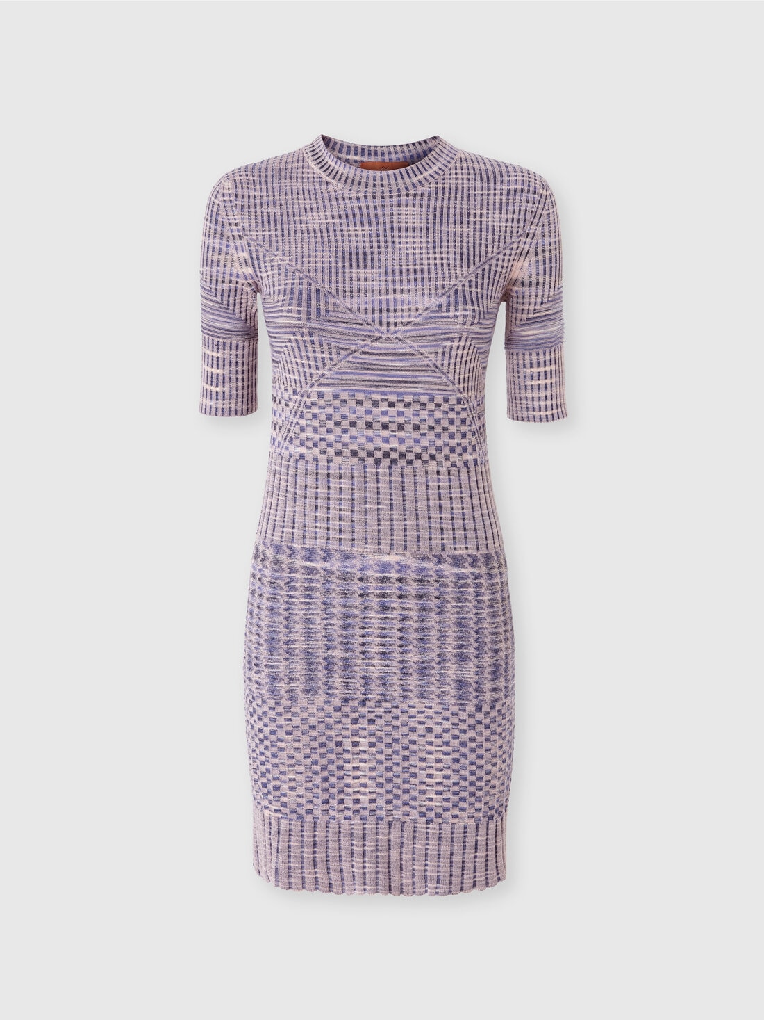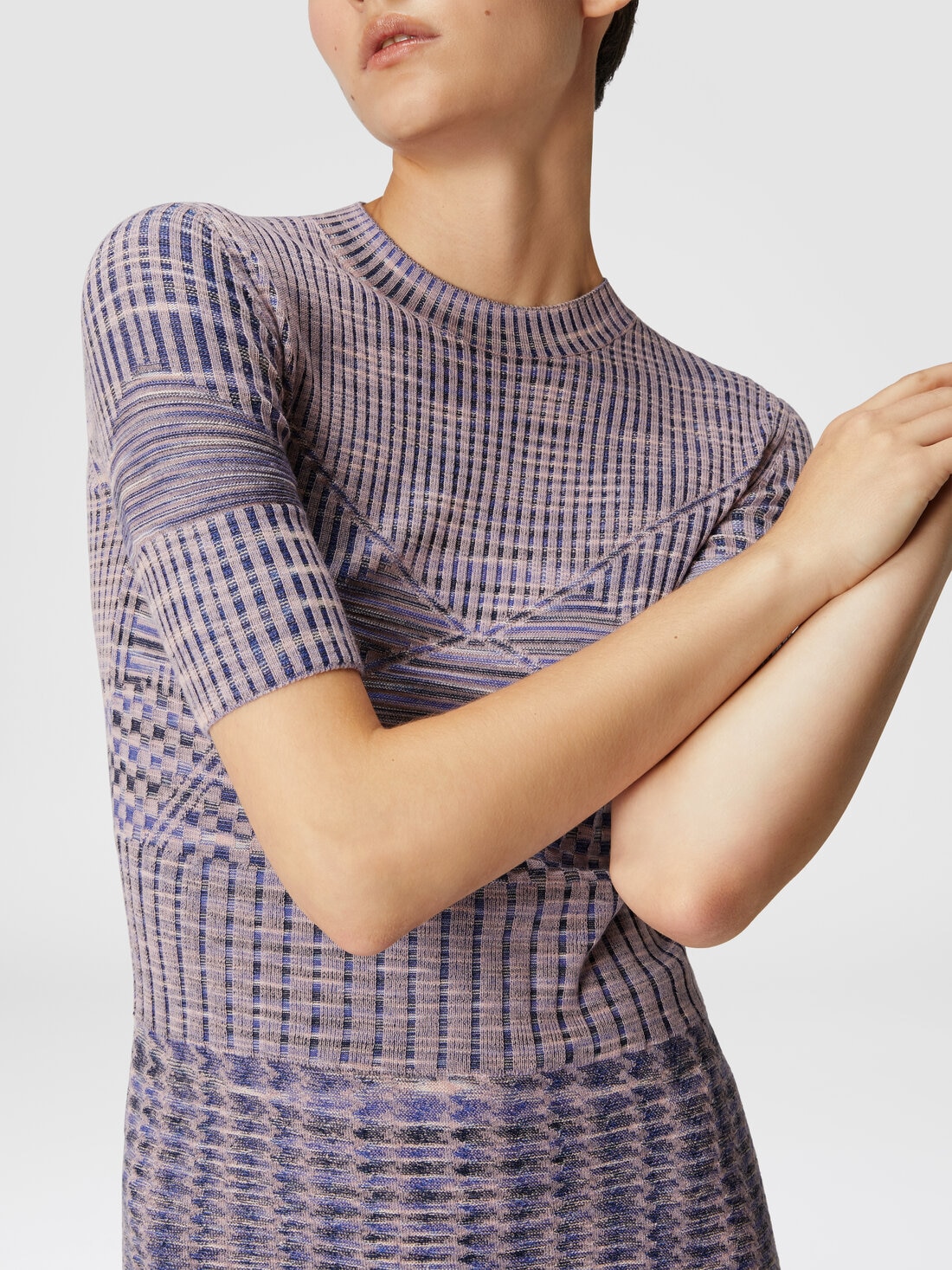 Aderisce al corpo, sottolineando la silhouette, il mini-abito a maniche corte in pura lana fiammata. Un capo dal carattere avvolgente, perfetto per affrontare con stile la stagione fredda.