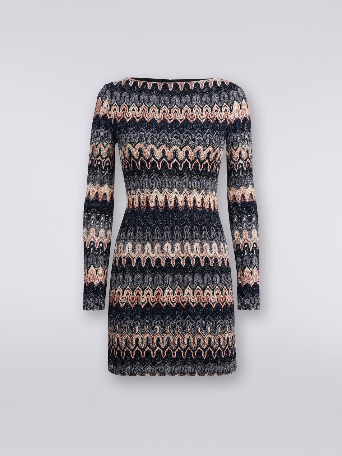 Adornato da un motivo a onde nella sua interezza, il mini-abito a maniche lunghe con scollatura a barchetta accompagna con grazia la silhouette. Un modello classico, interpretato in una nuova versione impreziosita da dettagli inconfondibili come la lavorazione raschel effetto pizzo e i fili lamé.
