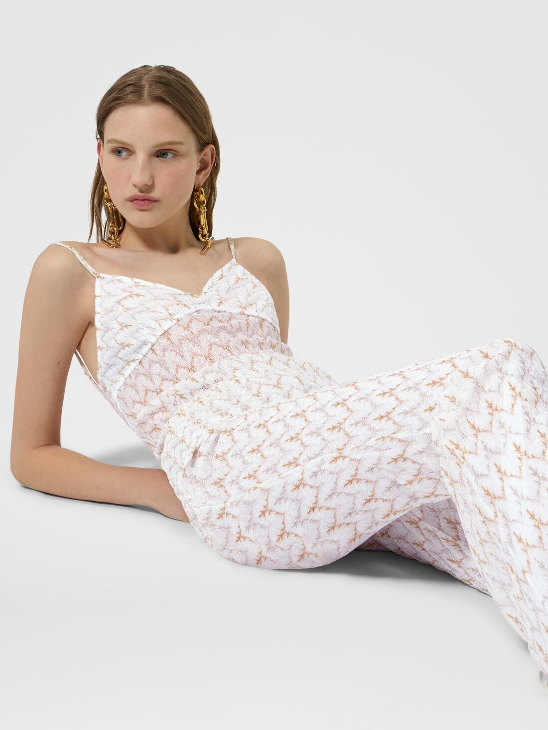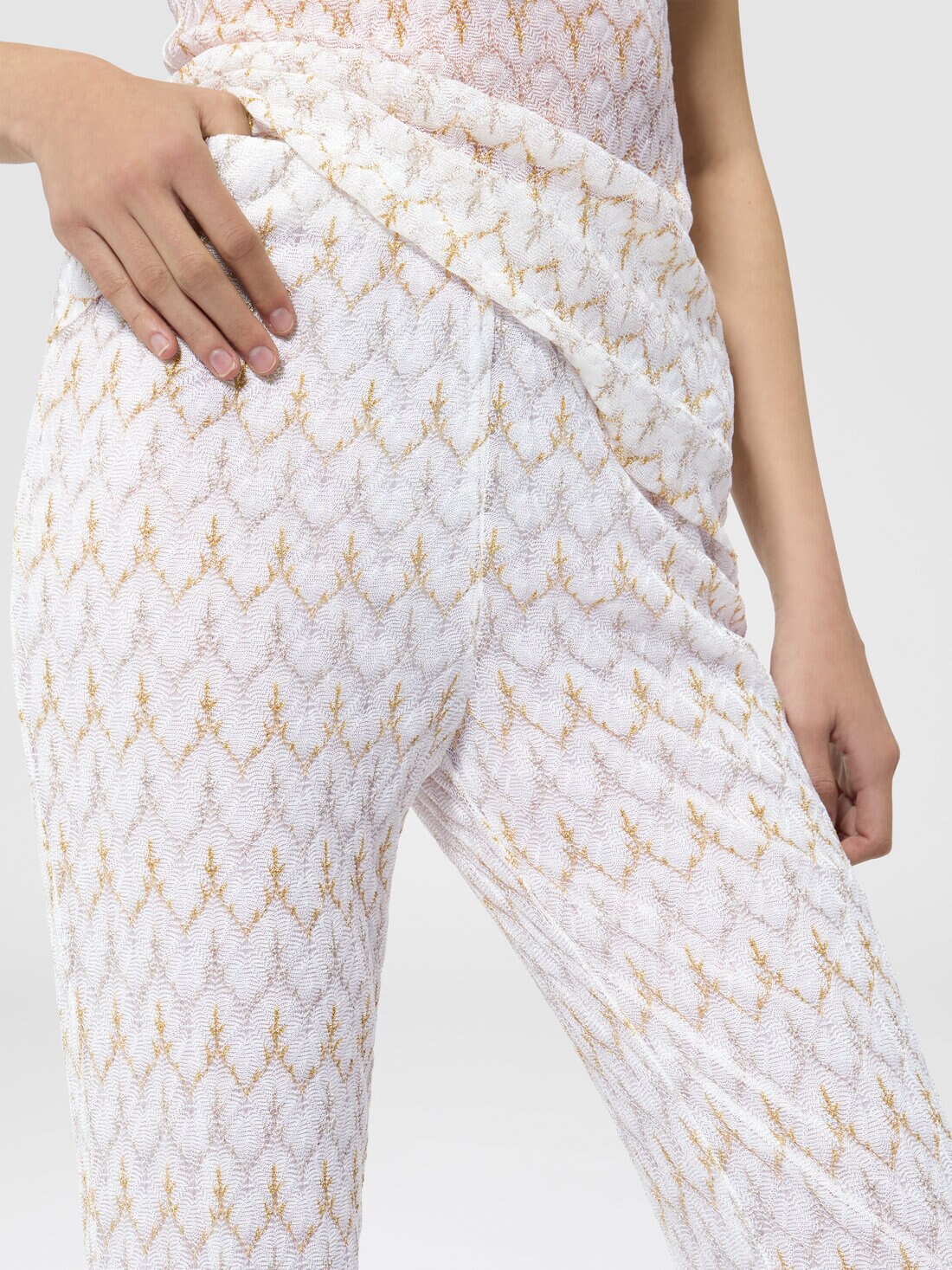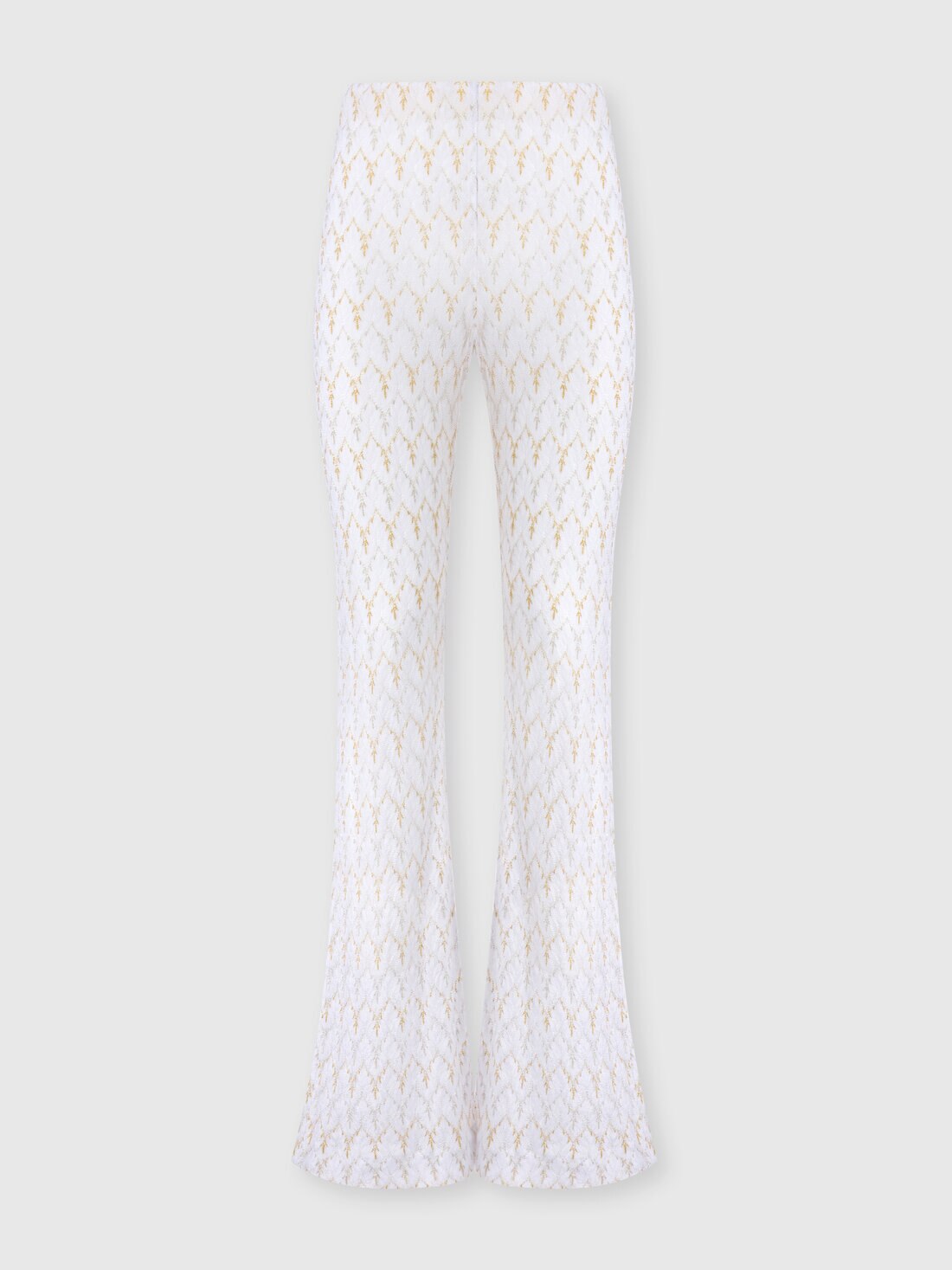 Un’eleganza fluida definisce questi pantaloni flare da donna, realizzati in lavorazione raschel in pizzo zig zag in misto viscosa lamé. La texture luminosa accompagna il movimento, valorizzando la silhouette con naturale femminilità e raffinatezza.