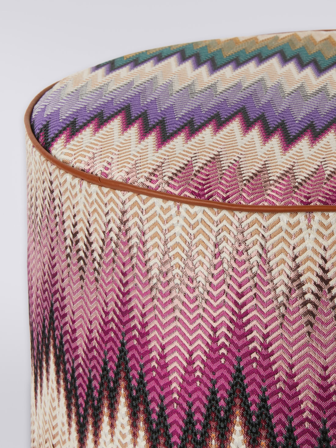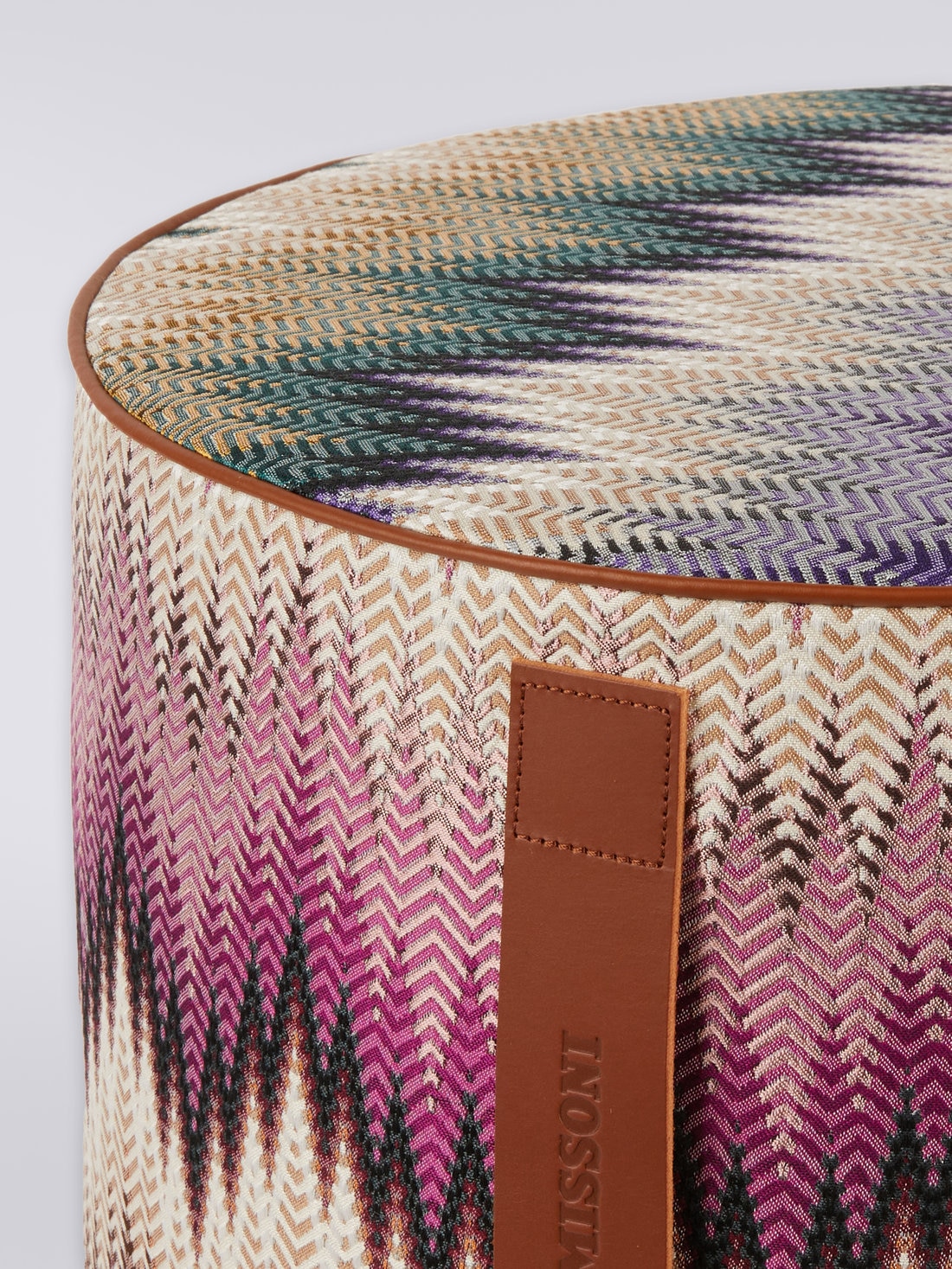 Un gioco di fantasie e lavorazioni che si intrecciano e sovrappongono caratterizza il pouf cilindrico 40x30 cm Phrae. Realizzato in misto cotone, e arricchito dal piping e dal manico in pelle con logo impresso, questo complemento d'arredo per la casa offre una versione 3D del motivo chevron.