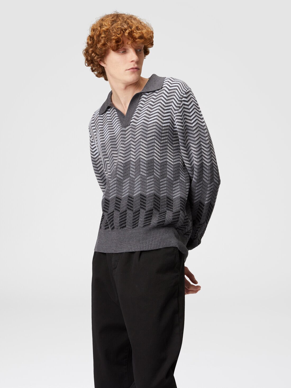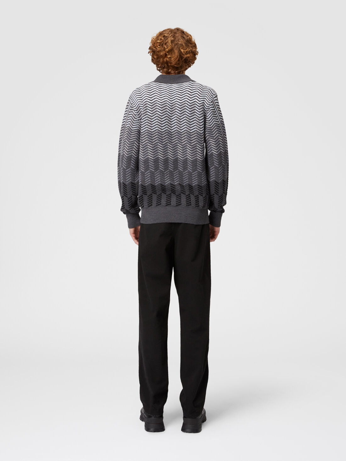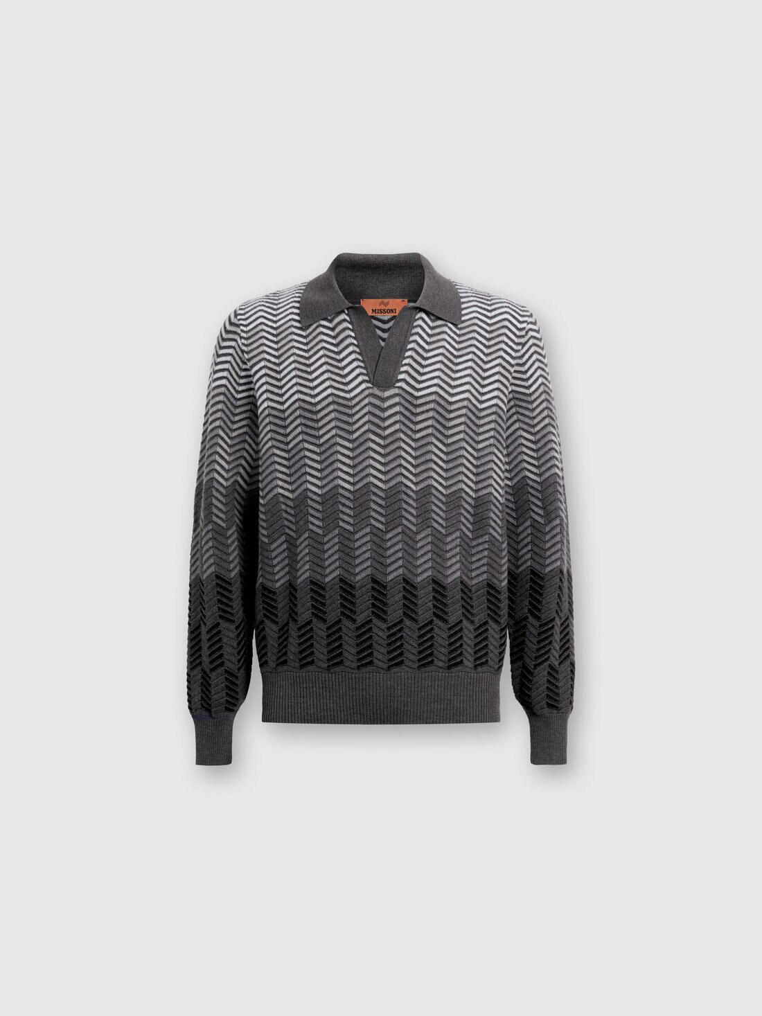 Riscrive gli stilemi della polo a maniche lunghe il modello in maglia di pura lana vergine. I profili a contrasto esaltano la raffinatezza del pattern zig zag dégradé, in questo capo che unisce il casual quotidiano ad un'eleganza décontracté.