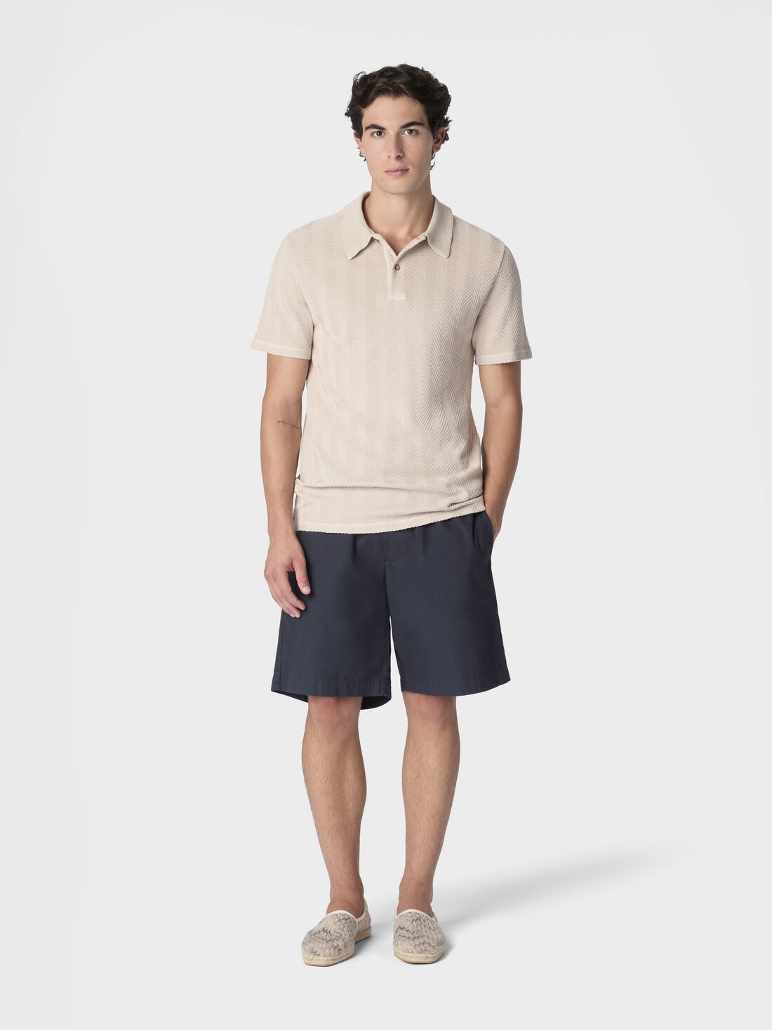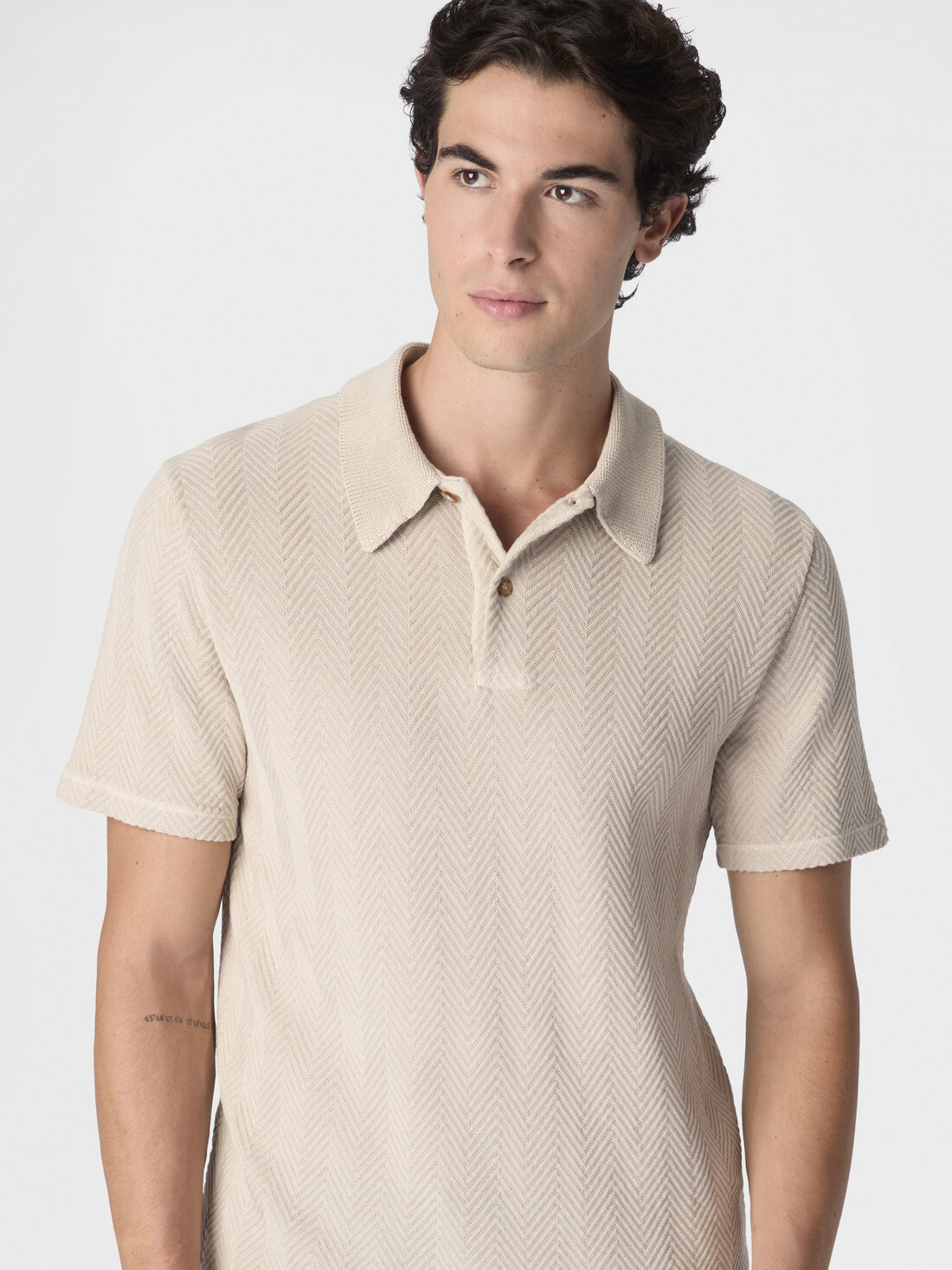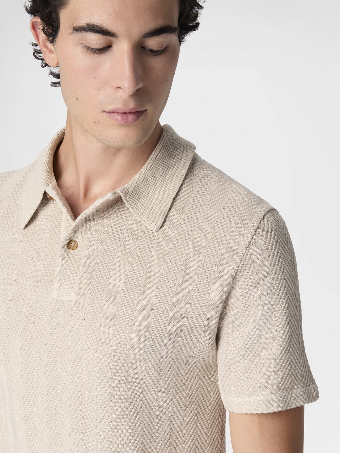 La trama zig zag tono su tono, realizzata con lavorazione raschel, definisce il carattere distintivo di questa polo da uomo a maniche corte in cotone e viscosa. Un modello che coniuga comfort e raffinatezza, esprimendo l’eleganza iconica della maison.