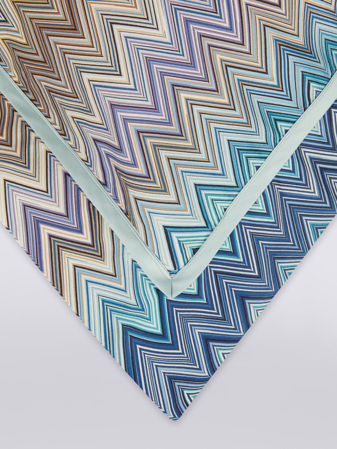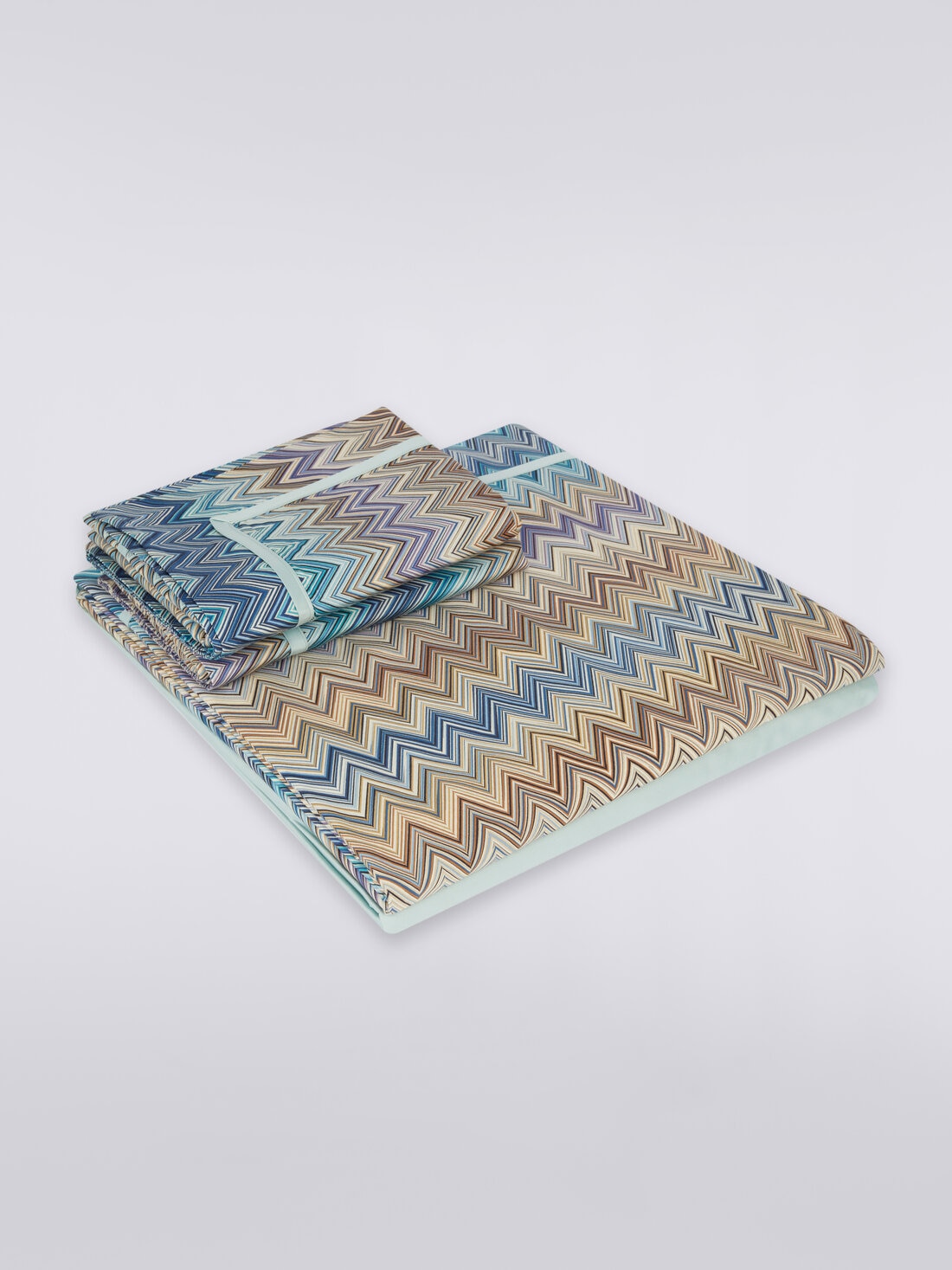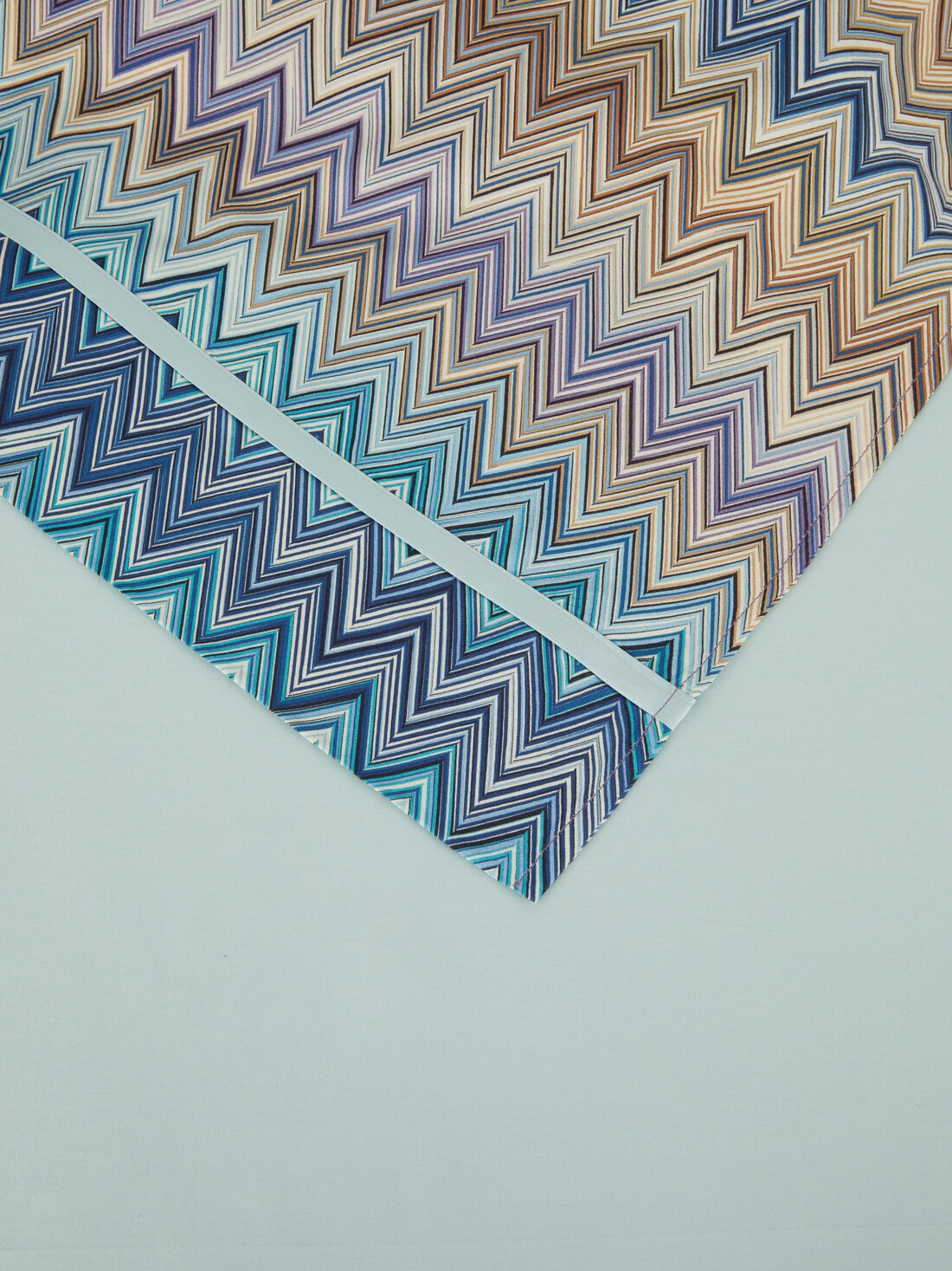 Il set da tre pezzi matrimoniale John offre un completo per il letto in puro cotone fiammato, portando il raffinato stile di Missoni nella stanza più intima della casa. Comprende lenzuolo inferiore e superiore dalle dimensioni 250x280 cm e una coppia di federe, esprimendo un'elegante interpretazione dell'iconicità Missoni.